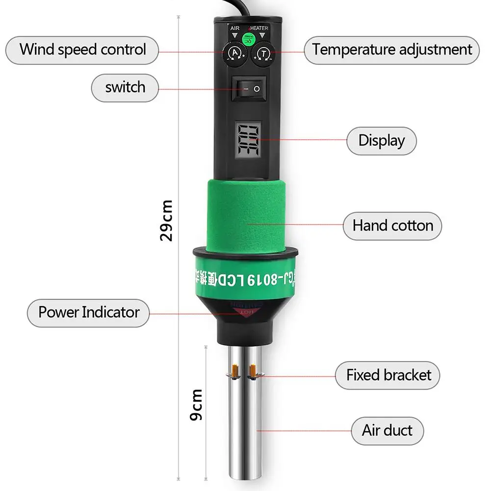 Характеристики продукта: 1. Цифровое управление и цифровой дисплей2. Бесщеточный вентилятор 3. Режим постоянной температуры 4. Автоматический режим5. Режим подключения и выключения 6. Портативная машинаГарантия!Используйте эту машину, следующие основные меры должны соблюдать, избегать поражения электрическим током или повреждения при использовании ca во время пожаров.1. Для обеспечения личной безопасности после того, как машина выполнит работу, отключите шнур питания.2. Вы должны использовать оригинал или рекомендации деталей, иначе это приведет к серьезным последствиям.3. Оборудование для отказа должно быть отремонтировано профессионалами.4. Горячий воздух открыт, его температура, вероятно, достигнет 400 ℃. Не используйте его вблизи легковоспламеняющихся газов, предметов. Трубка и горячий воздух очень горячие, могут сжечь тело, не прикасайтесь к горячей трубе и прямой впрыск для нагрева человеческого тела.5. Горячий воздушный пистолет включен, не покидать место работы.6. Когда раскрывается пистолет горячего воздуха, не устанавливайте сопло, тепловая труба и сопло должны быть охлаждены, затем установите другую сопло.7. Пожалуйста, сохраняйте поток воздуха на входе и выходе, не имейте препятствий.8. После использования не забудьте охладить корпус, машинку следует положить в рамку, затем выключить и уснуть.9. Обращайтесь с осторожностью, не делайте сильной вибрации.10. Аппаратная Сварка поглотит дым, пожалуйста, сделайте правильную вентиляцию.⏰. Характеристики Продукции1. Цифровое управление и цифровой дисплей: с датчиком замкнутого контура и высокой мощностью, температура контролируется ШИМ и цифровым ЖК-дисплеем, что приводит к стабильной и точной температуре. Он может адаптироваться к различным целям.2. Бесщеточный вентилятор: Бесщеточный вентилятор внутри приводит к регулировке потока воздуха, нежный ветер, долгий срок службы двигателя и низкий уровень шума3. Режим постоянной температуры: точность и стабильность температуры, без эффекта ветра.4. Автоматический режим: в машине есть датчик, система входит в режим работы (тепло-дуновение воздуха-делаем температуру постоянной) до тех пор, пока вы берете машинку, И он переходит в режим ожидания (остановить нагрев-охлаждение-задержать сон), когда он снова установлен на раму. Длительный срок службы нагревательного элемента и защита пистолета горячего воздуха. Он прост в использовании.5. Режим подключения и выключения: интерфейс нагревательного элемента является разъемом и легко заменяется.6. Портативная машина: небольшой размер светильник.Вес изделия: 0,439 кгВес посылка: 0,647 кгРазмер изделия (Д х Ш х В): около 28,00 х 4,00 х 4,00 см/11,02 х 1,57 х 1,57 дюймаРазмер посылка Д х Ш х В): 33,00 х 13,50 х 10,00 см/12,99 х 5,31 х 3,94 дюймаСписок:1 пистолет горячего воздуха GJ - 8019LCD4 x насадка1 x кронштейн1 x двуязычное руководство на английском языке
