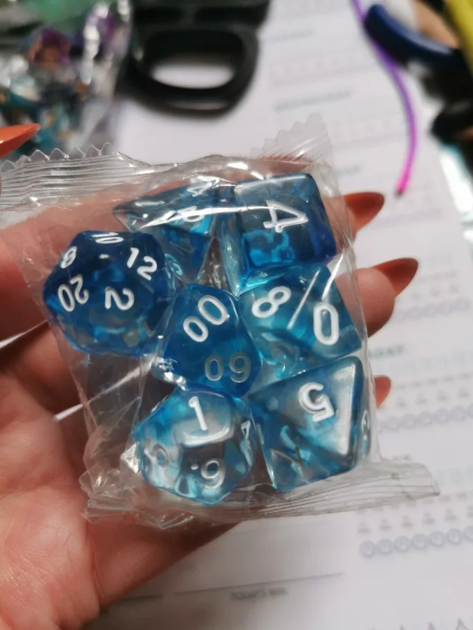 Каждый цвет поставляется с 7 различными игральными костями: 4, 6, 8, 10, 12, 20 двухсторонними игральными костями.