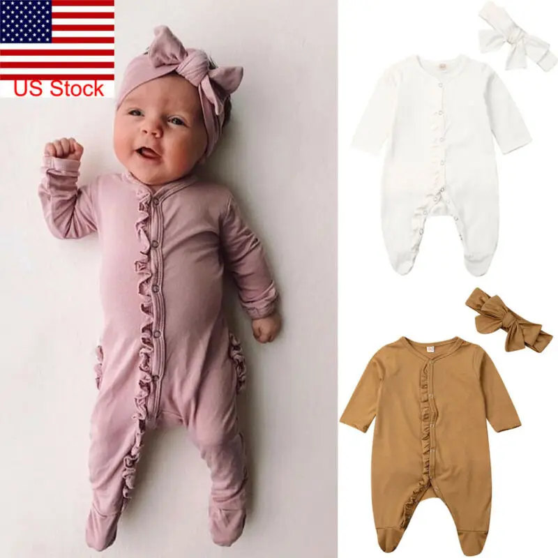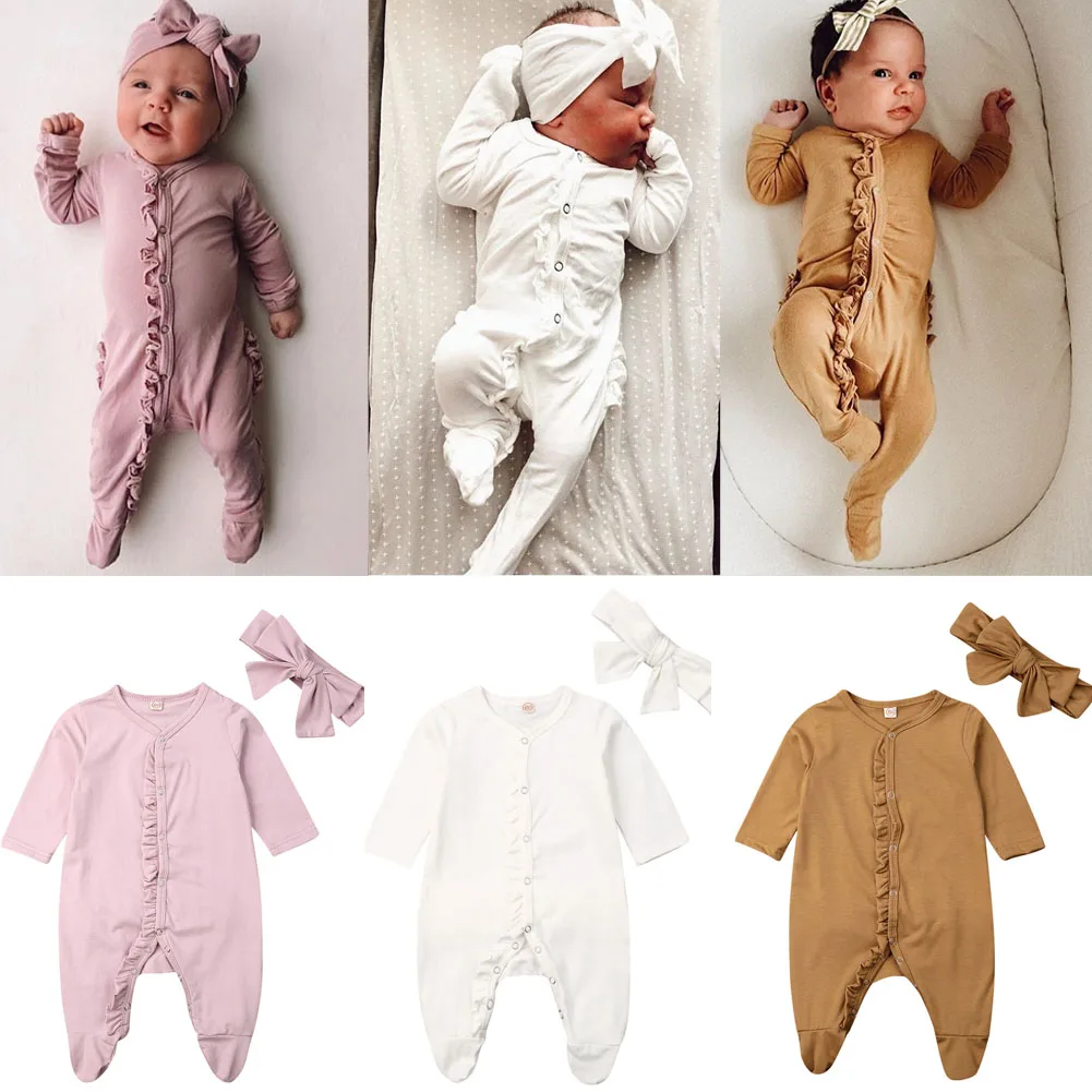 Новый Модный хлопковый комбинезон Focusnorm для новорожденных 0-12 месяцев, для маленьких мальчиков и девочек, однотонный комбинезон с длинным рукавом, одежда, повязка на голову, комплект из 2 предметов