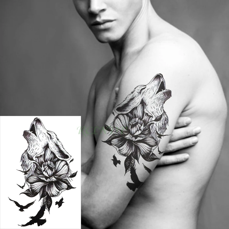 Водостойкая временная татуировка-наклейка, Волчья Голова, птица, животное, цветок, тату, черная флэш-тату, искусственная Большая татуировка для мужчин и женщин