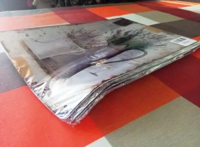 Тонкий лист жести. Упаковано в пенопласт, но при транспортировке все равно помялся, бока выгнулись(( либо заказывать надо больше штук, чтобы жёстче было, либо не знаю ещё что. Принт сам по себе симпатичный.