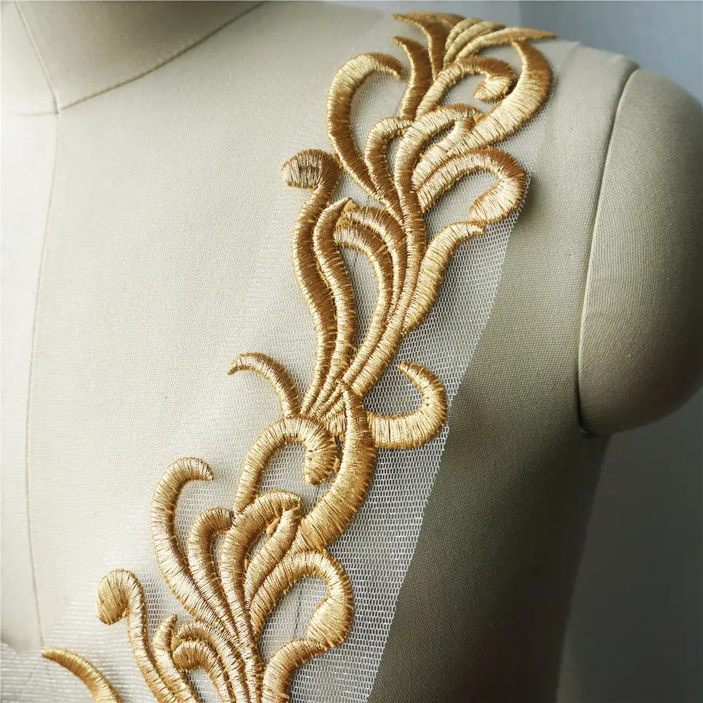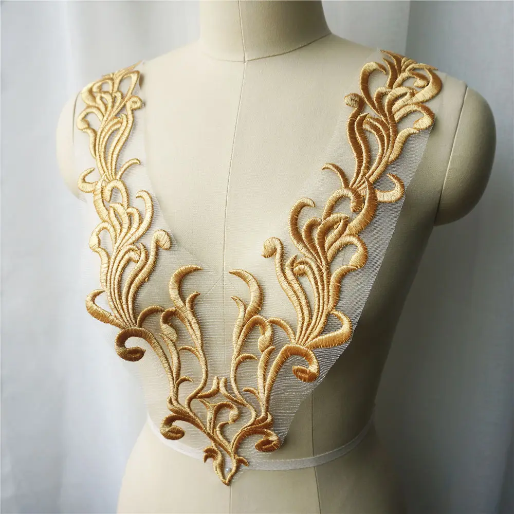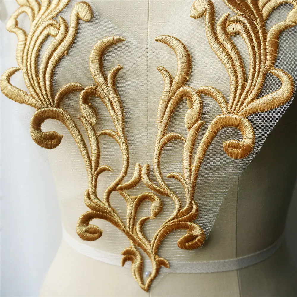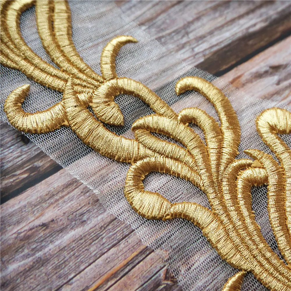 Золотая кружевная ткань, вышитые аппликации для платья, воротник с цветами, сетка в стиле барокко, винтажные нашивки для свадебного украшения платья, сделай сам