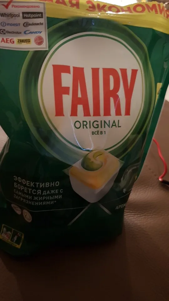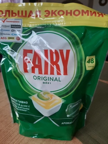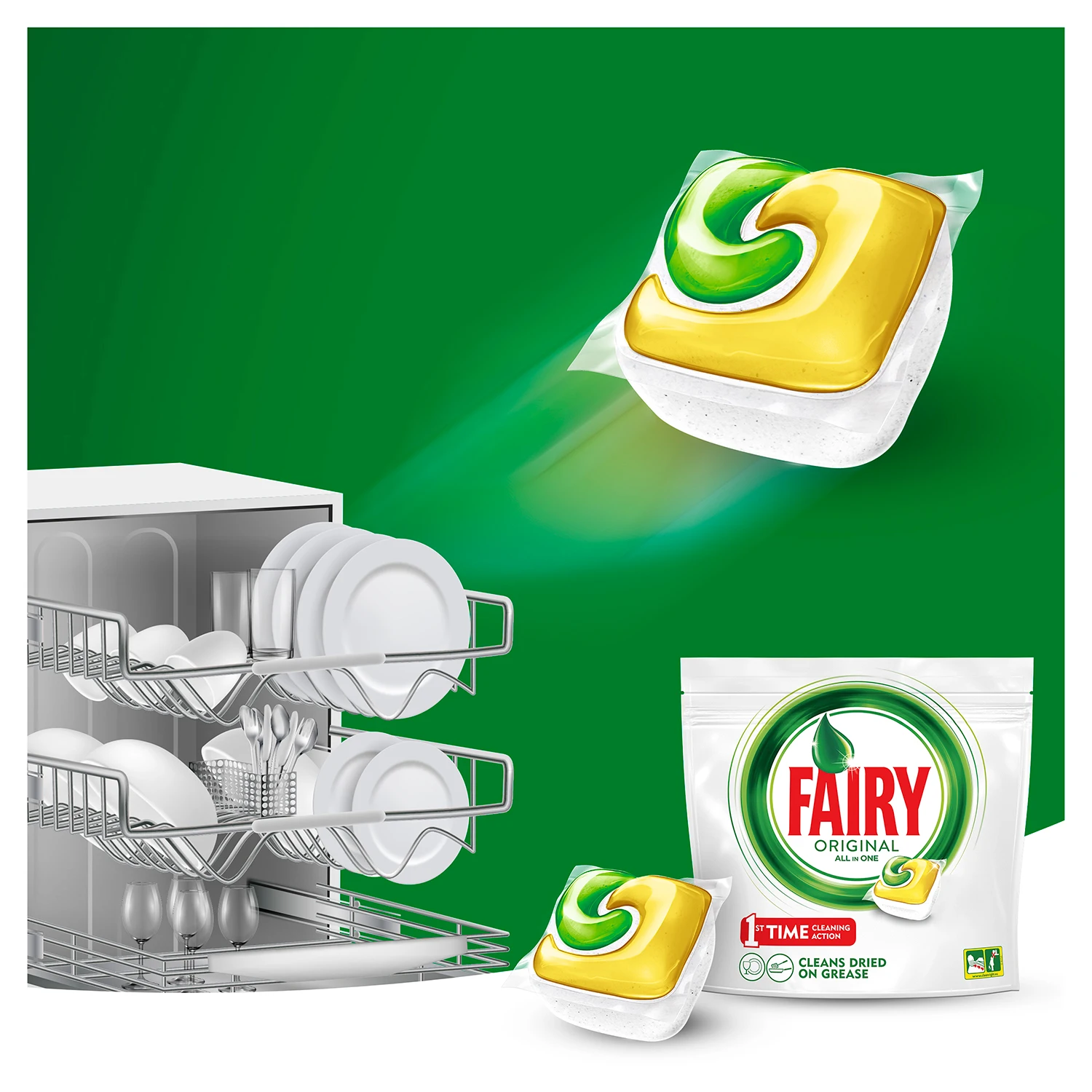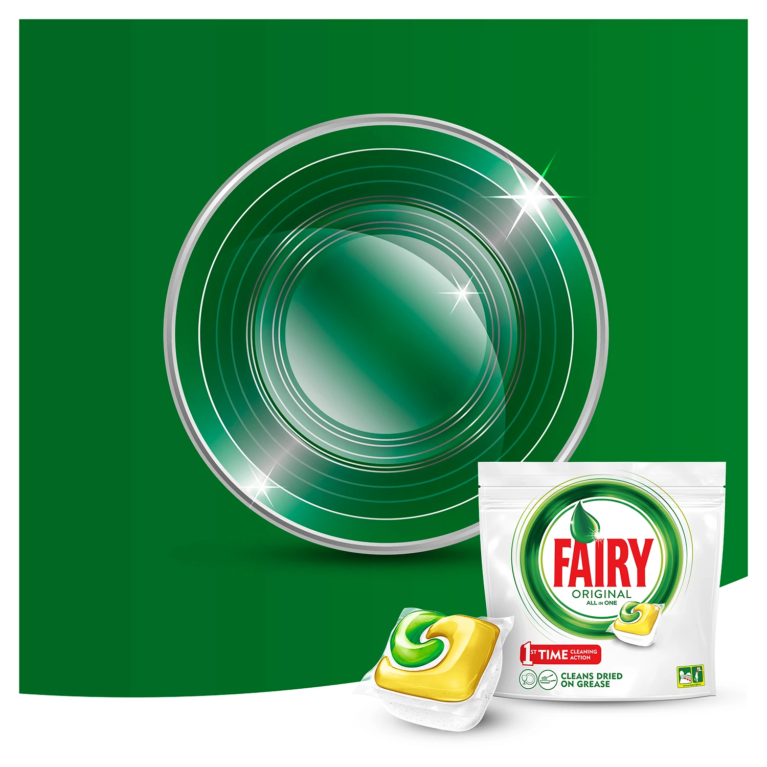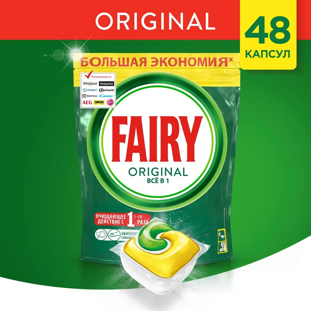 Капсулы для посудомоечной машины Fairy Original All in One идеально отмывают посуду со сложными загрязнениями с 1-го раза. Fairy Original содержит гель и порошок в одной капсуле. Капсула растворяется гораздо быстрее, чем другие таблетки для посудомоечной машины, и поэтому начинает действовать немедленно. Кроме того, капсулы Fairy очень просты в использовании – просто поместите их в посудомоечную машину (не нужно распаковывать).