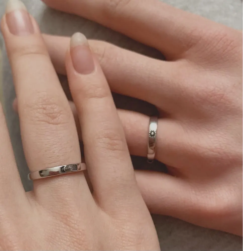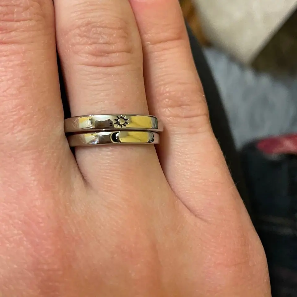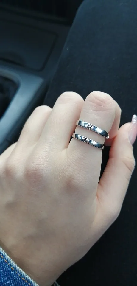 Очень миленькие колечки. Пришли в консолидированной посылке. Заказала 23.11, забрала в пятёрочке 8.12. Очень хорошо обработаны. Чёткая гравировка. Надеюсь, что не будут окисляться. Солнце больше луны. Раздвигаются.