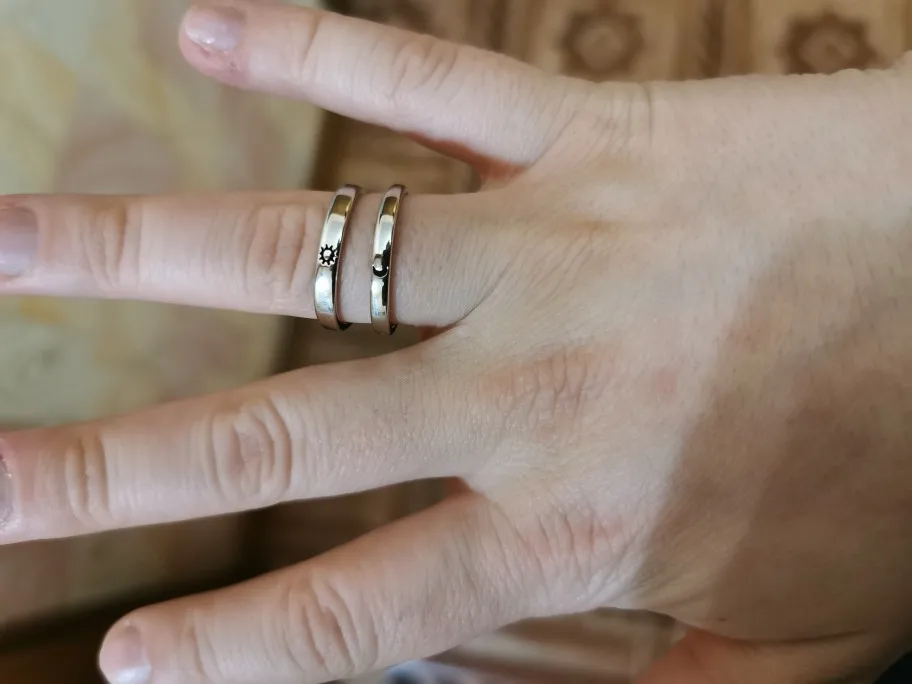 Очень милые кольца. С солнцем будет чуть больше, тк пальцы не особо толстые, не очень удобно регулировать на нем размер. Но в общем все круто мило класс, спасибо, к покупке рекомендую. Пришло через неделю-две в мск