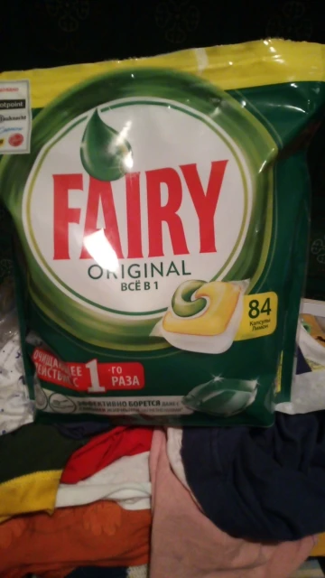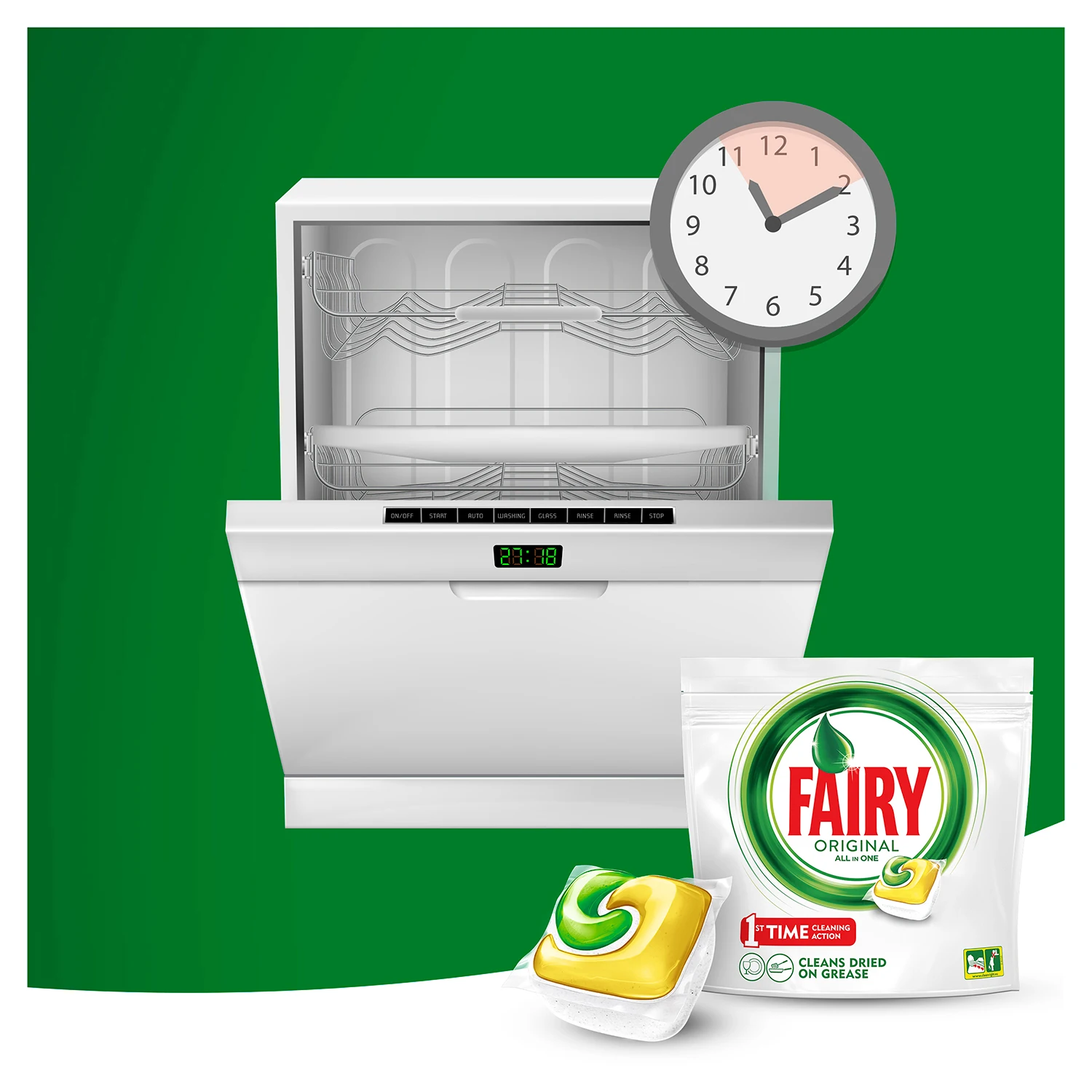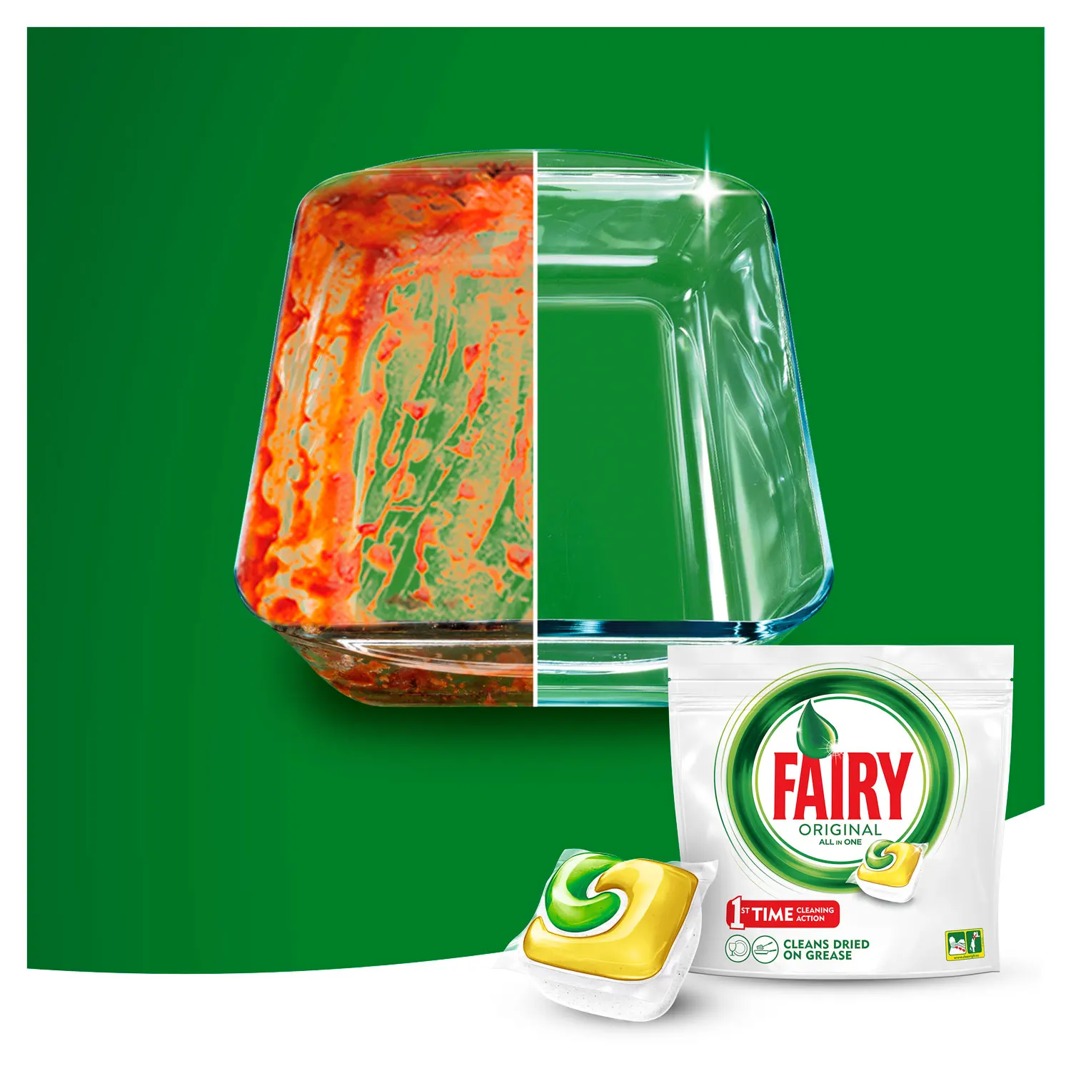 Капсулы для посудомоечной машины Fairy Original All in One идеально отмывают посуду со сложными загрязнениями с 1-го раза. Fairy Original содержит гель и порошок в одной капсуле. Капсула растворяется гораздо быстрее, чем другие таблетки для посудомоечной машины, и поэтому начинает действовать немедленно. Кроме того, капсулы Fairy очень просты в использовании – просто поместите их в посудомоечную машину (не нужно распаковывать).