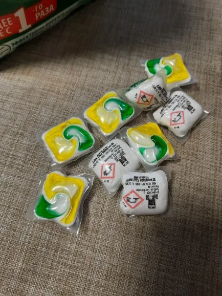 Хорошие капсулы, запах после открытия пачки ужасный, но на балконе выветрился. Моют хорошо. Рекомендую