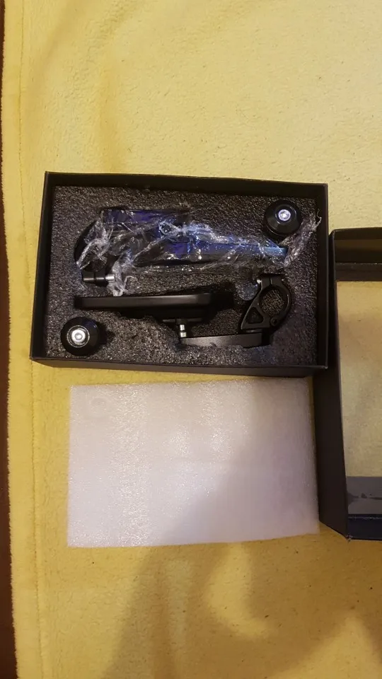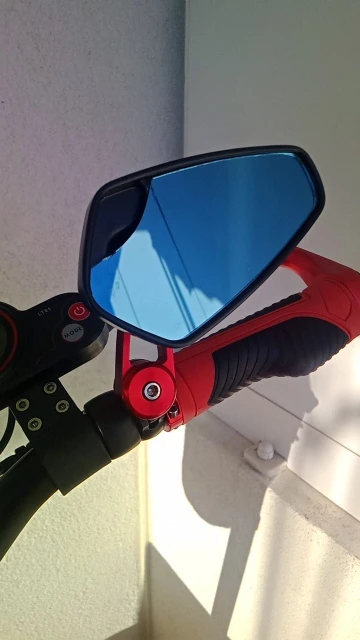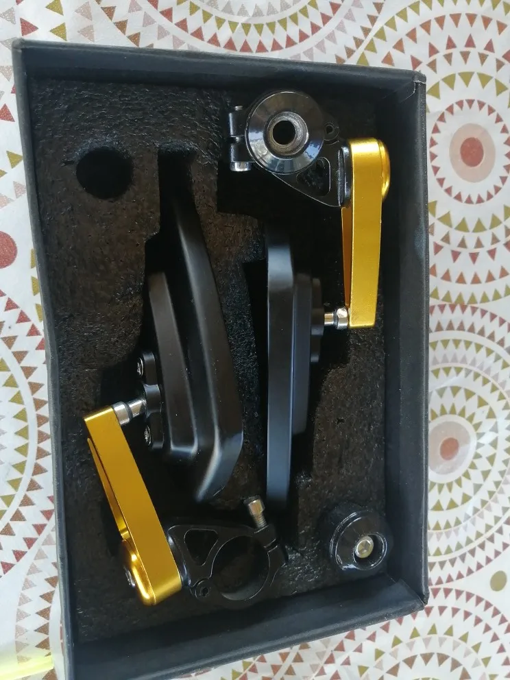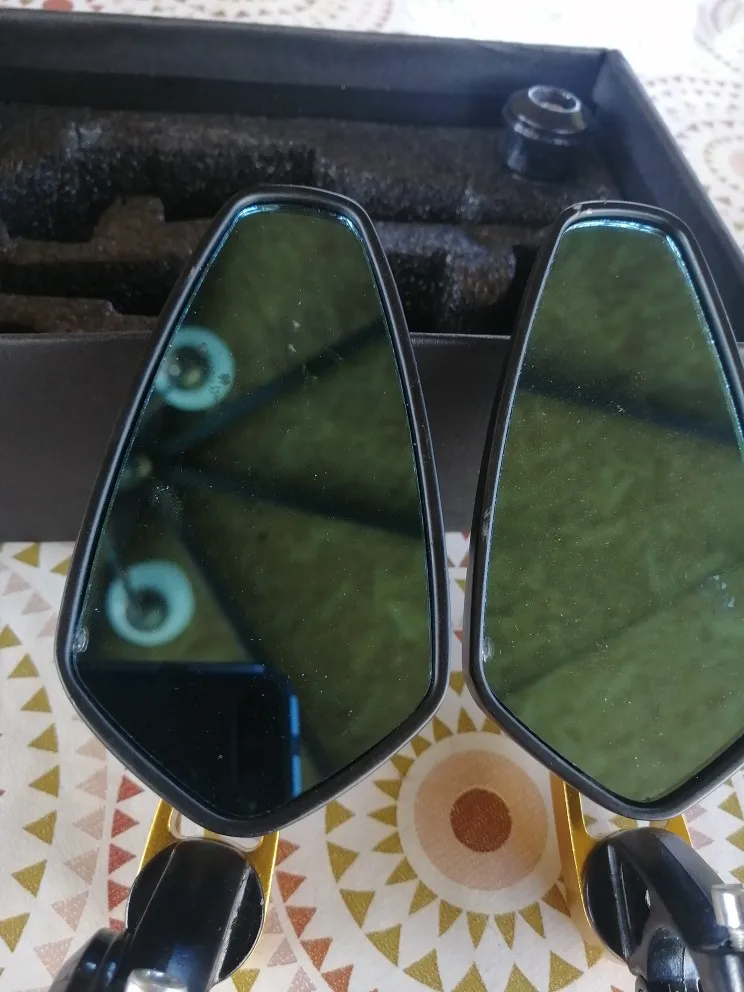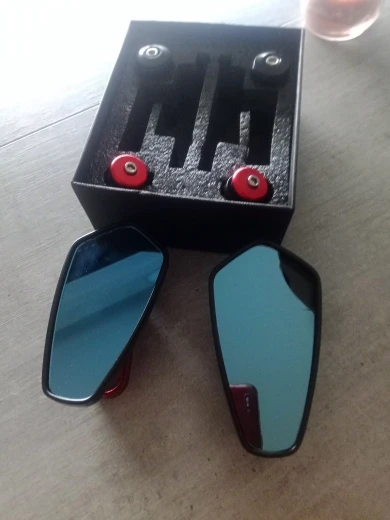 Приехали в прикольной коробочке, так что за сохранность товара можно не переживать. По самим зеркалам. Есть немного косячки по окраске. Синий цвет зеркального элемента не понравился, но это чисто моя претензия, не обратил сразу на это внимание. Главное, данные зеркала не получилось разместить над рукоятками. Крепеж очень невысокий и защитой перчаток задевается зеркало. А разворот в другую сторону увеличит боковой интервал и мешает в пробках.