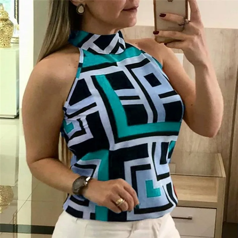 Майка женская размера плюс с геометрическим принтом, халтер, пикантный Повседневный Топ без рукавов, футболка с открытыми плечами