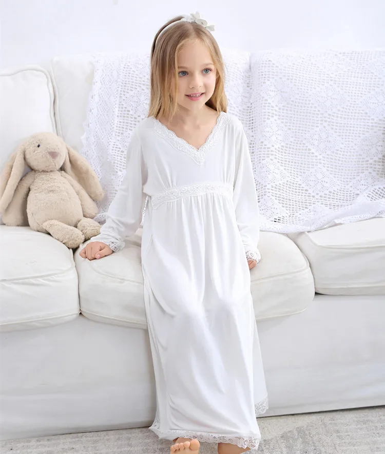 Осенняя ночная рубашка для девочек, белая хлопковая длинная ночная рубашка для девочек, Европейская свободная мягкая детская одежда для сна, кружевная домашняя одежда для детей 2-7 лет