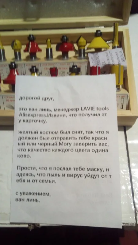 Несмотря на то,что товаром,играли на таможне или на почте,заказ прибыл через 2 недели до Белгорода.(Упаковка товара стала грязнобелой)Фрезы визуально в порядке..Не знаю когда опробую,тогжа добавлю отзыв..Да,что совершенно не понравилось,так это шестигранный ключ для подшипников болтающийся по всей коробке с фрезами и петли прикрученные неровно...Поэтому звездочку сниму..