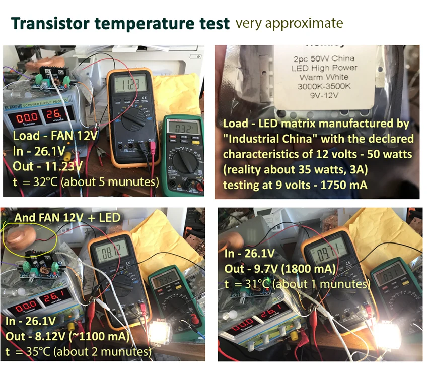 Пайка добротная, транзистор на теплопроводящей подложке. Сделал тест. Производитель заявляет о 8 амперах. Мне понадобится 4-5 ампер, что находится в оптимальной зоне устройства. Использоваться будет для плавности 100-ваттной led-матрицы. Обычно эти ШИМы начинают греть и звенеть, когда велика разница по напряжению: когда подаём 36 вольт, а снимаем 9, да ещё и на 90% мощности. На скорую руку проверил точность параметров без нагрузки и под нагрузкой 1,8А - 9 вольт с замером температуры площадки транзистора термопарой. При температуре в комнате 19 градусов, входящего напряжения 26 вольт, напряжения на выходе 9,7 вольт, в качестве нагрузки использовалась led-матрица 50 ватт/12 вольт (реально 35-40 ватт), то есть ватт 20 было, и вентилятор кулера 12 вольт параллельно, температура площадки за несколько минут не превысила 35 градусов. Конденсаторы не звенели, писка не было. На всякий случай проверял температуру пальцем. Вроде соответствует. Я считаю - хорошие результаты. Буду брать.
