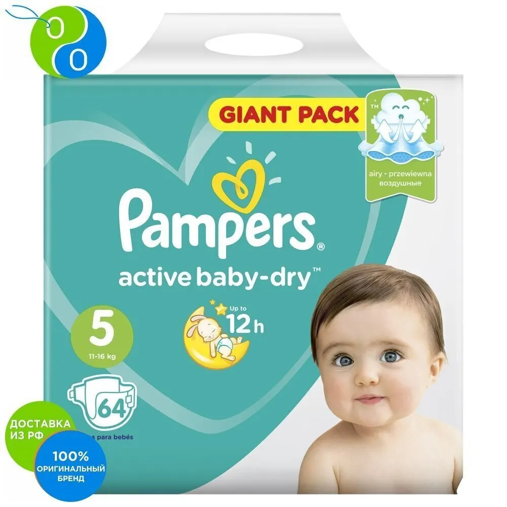 Подгузники Pampers Active Baby-Dry 11–16 кг, размер 5, 64шт.