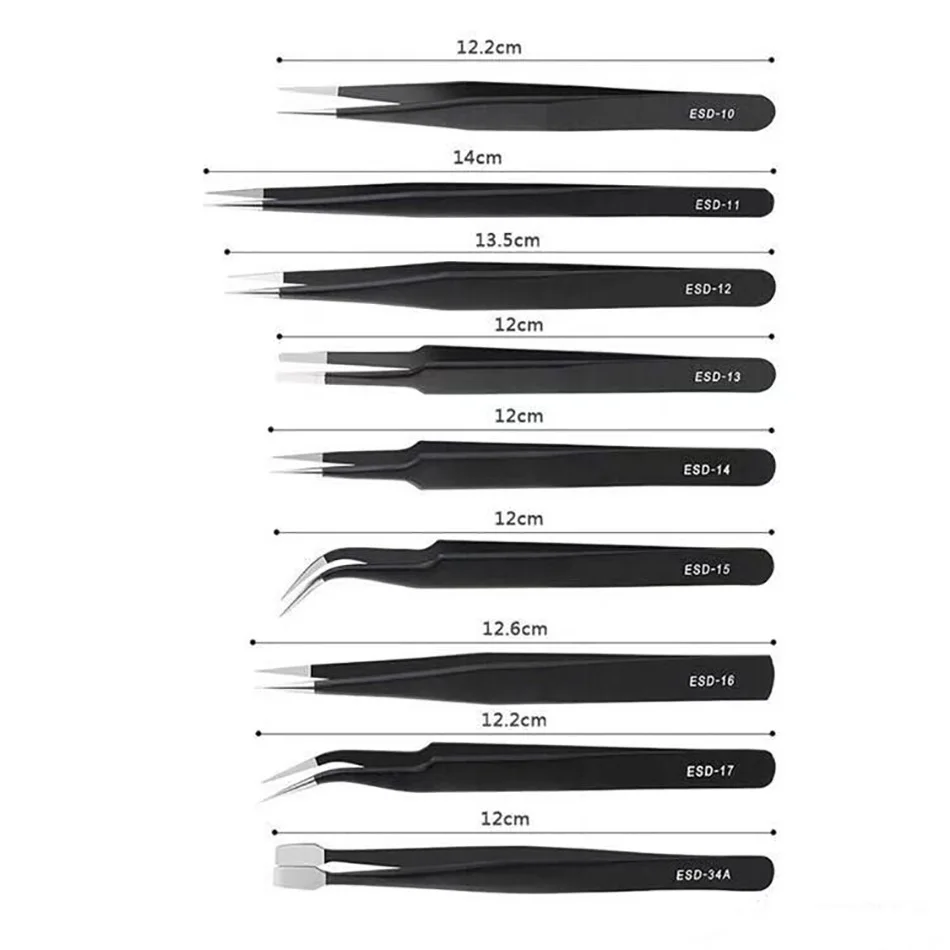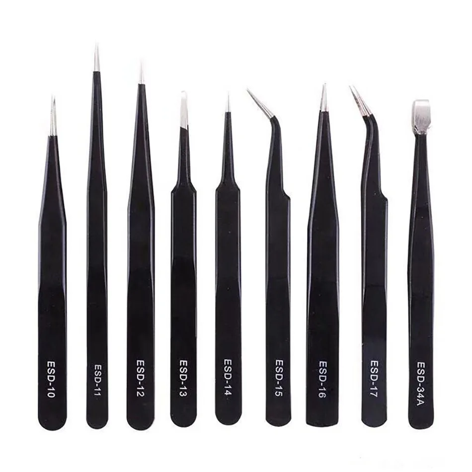 Набор антистатических пинцетов из нержавеющей стали ESD, инструменты для технического обслуживания, промышленные прецизионные изогнутые прямые щипцы, ремонтные инструменты, 9 шт.
