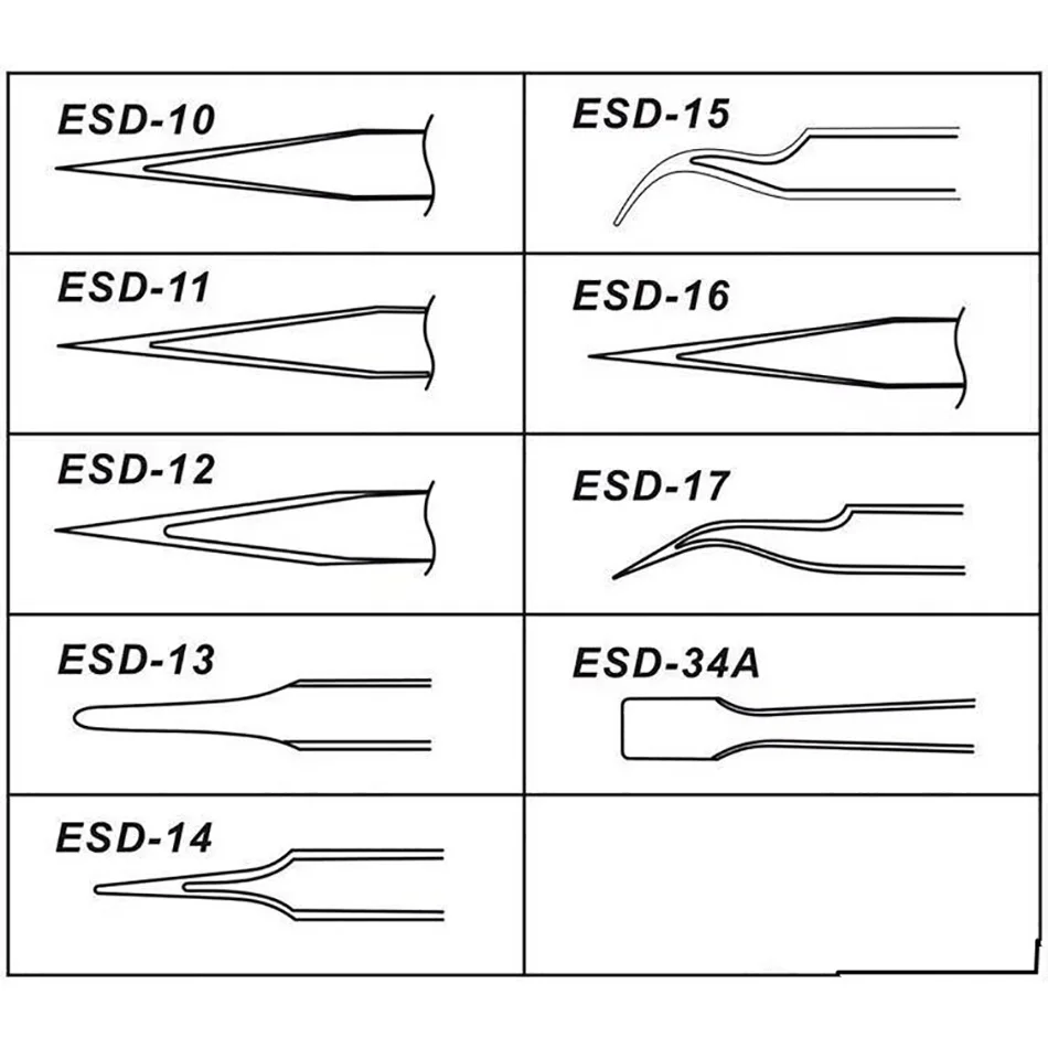 Название продукта: Антистатический пинцет Материал изделия: нержавеющая сталь + проводящий углеродный черный Номер товара: ESD-10, ESD-11, ESD-12, ESD-13, ESD-14, ESD- 15,ESD-16,ESD-17,ESD-18,ESD-34A