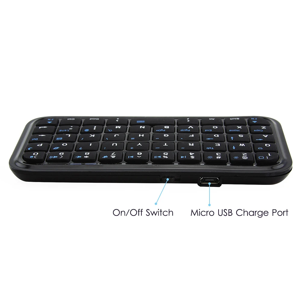 • Размеры: appr. 114*60*9 мм• Цвет: черный• Версия Bluetooth: Bluetooth V3.0• Мини-клавиатура с 49 кнопками• Встроенный литий-ионный аккумулятор, порт Micro USB для зарядки.• Цветной светодиодный индикатор рабочего состояния.• Встроенное интеллектуальное программное обеспечение управления питанием для энергосбережения.• Время зарядки: 3-4 часа• Идеально подходит для ввода электронных писем, чатов и игр в игры.• Размер кармана, гладкий и тонкий дизайн.