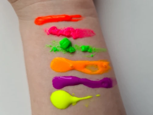 Консистенция кремовая, наносить разве что пальцем. Почему то фиолетовый цвет был черезчур густой, видимо как то подсох. Лично мне почему то вместо розового положили ещё один оранжевый, в итоге 3 практически идентичных цвета.