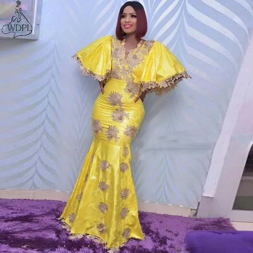 Вечернее платье с юбкой-годе, ярко-желтое фатиновое платье с коротким рукавом, длинные платья в Африканском и арабском стиле для выпускного вечера, кружевное платье с аппликацией