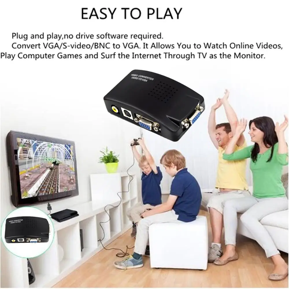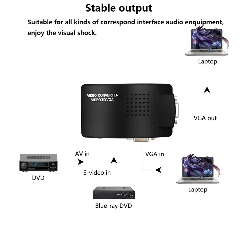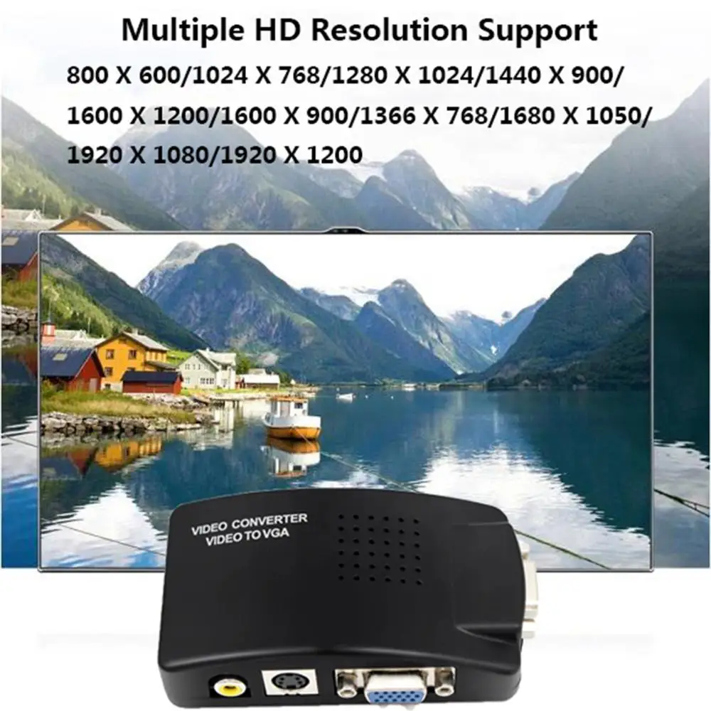 Обзор:RCA/ AV/VGA/ S-video to VGA video Converter имеет композитный RCA/ AV/VGA/ S-video вход, VGA выход. Идеально подходит для камеры видеонаблюдения, dvd-плеера, цифрового спутникового телевидения (DSTV) с композитным RCA/s-видео для отображения на мониторе VGA/TV для образования, бизнес-презентации, коммерческого продвижения, конференции, выставка, И т. Д. Простое переключение между разными входными источниками.Он может работать без ПК/ноутбука, Передача видеосигнала с композитного RCA/ AV / S-Video на VGA, его нельзя использовать с пониманием.Спецификация:1. Цвет: черный2. Тип продукта: VGA/S-video/Композитный RCA/ AV-VGA конвертер3. Входной порт: VGA, S-video(4 pin), Композитный RCA/ AV4. Выходной порт: VGA5. Источник питания: 5 В постоянного тока 1A6. Тип штепсельной вилки: штепсельная вилка стандарта США7. Передача видеосигнала от композитного RCA/ AV / S-Video к VGA, его нельзя использовать с пониманием.Особенности:1. Частота обновления может быть легко переключена на amaong 60HZ-75HZ и фотографии не мерцают2. Разрешение может быть легко переключено между (800X600/1024X768/1280X1024/1440X900/1600X1200/1600X900/1366X768/1680X1050/1920X1080/1920X1200),CRT монитор и ЖК-монитор все совместимы3. Уникальная функция сброса, чтобы предотвратить слишком высокое разрешение, тогда машина не может показать дисплей сброса4. Супер 3D Функция шумоподавления изображения, делает фотографии более четкими, стабильными5. Интерфейс AV/S-Video input может быть подключен к DVD/PDP/PS2/игровой консоли и т. д.6. Широкополосный переключатель PC/TV (200 МГц)7. Преобразование VGA/s-видео/Композитный RCA/ AV в VGA8. Включите DVD/DVR, CCTV (замкнутое телевидение), камеру и т. Д., чтобы отображаться на мониторе ПК или ЖК-дисплее9. Одна кнопка для легкого переключения между разными входными источниками10. Кнопка "вход", "меню"11. Регулируемый вход, яркость, контракт, насыщенность и оттенок12. Поддерживаемое разрешение выхода VGA: 800X600 60 Гц, 800X600 75 Гц, 1024X768 60 Гц, 1280X1024 Гц13.PAL/NTSC auto-detective14. Функция замораживания изображения15. Функция OSD (On-Screen-Display).16. Автоматическое Сохранение настроек и рабочее состояние при выключении питания.Применение:Подключите камеру видеонаблюдения, dvd-плеер, цифровое спутниковое телевидение (DSTV) с композитным RCA/s-видео для отображения на мониторе VGA/TV для образования, бизнес-презентации, коммерческого продвижения, конференции, выставки и т. Д.
