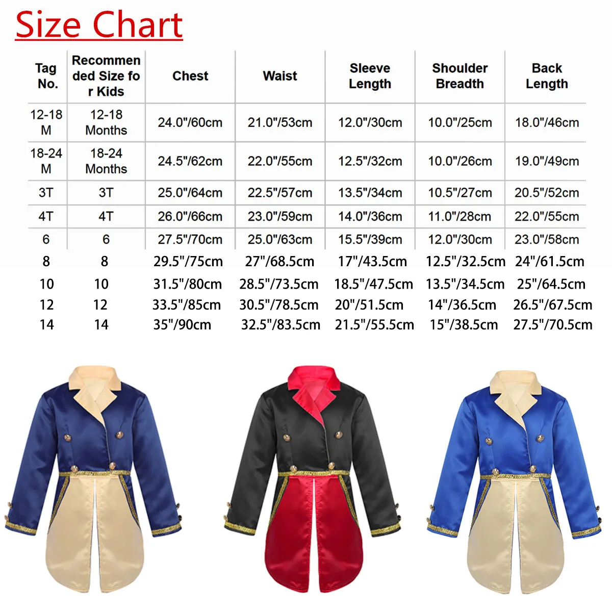 Особенности:Куртка изготовлена из полиэстера и атласа, ручная стирка.Таблица размеров означает возрастные диапазоны для мальчиков, но они предназначены только для общего ознакомления.Длинные рукава, воротник с лацканами. Декоративные пуговицы спереди и на рукавах. Ласточкин дизайн, центральное отверстие сзади.Золотая плетеная отделка украшает запястья и хвосты. Полностью на подкладке. Красивый костюм принца для вашего мальчика.Подходит для Хэллоуина, косплея, темативечерние НКИ, фотографии, праздников и т. д.