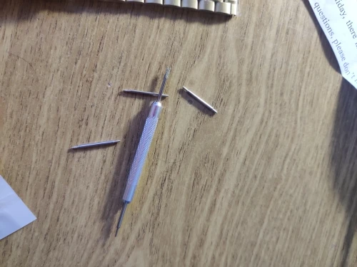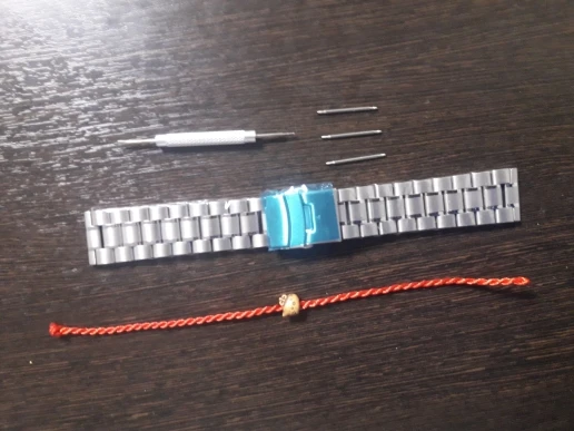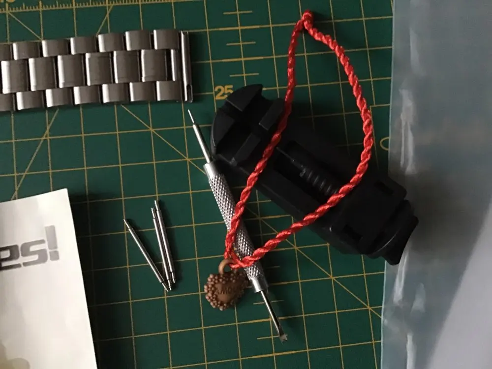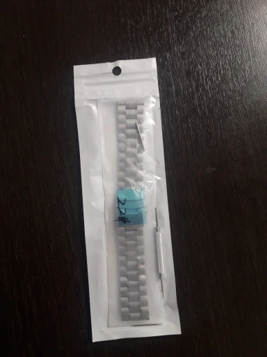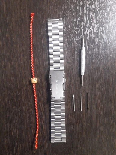 Ремешком доволен. Заказ пришел в Москву по истечении 2 недель. Забирал из почтомата в сетевом магазине "Пятерочка". В комплекте есть весь инструмент, необходимый для установки ремешка и снятия лишних его звеньев. Догадался, что черный станок предназначен для снятия лишних звеньев браслета.