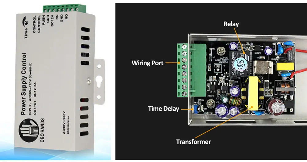 Характеристики продукта: 1. Этот источник питания 12 В/3 А. Подходит только для управления одним замком. 2. С управлением, Push, GND, DC12V, NC, без порта, может работать со всеми видами электрических замков. 3. С регулировкой задержки времени 0-30 секунд. 4. Рабочее входное напряжение AC90-260V, больше свободы. 5. Меньшее энергопотребление и высокая мощность. Небольшой коммутационный транзистор. Характеристики Товара: Входное напряжение: AC90V-AC260V 50-60 Гц Выходное напряжение: 12 В постоянного тока Мгновенный ток: 3 А Постоянный ток: 3,5 А Рабочая температура: 20 ℃ ~ 60 ℃ Влажность при эксплуатации: ✮90% Задержка времени: 0 ~ 30 с Функция дистанционного управления: Да Размеры: 138x67x37 мм (Д/Ш/В)