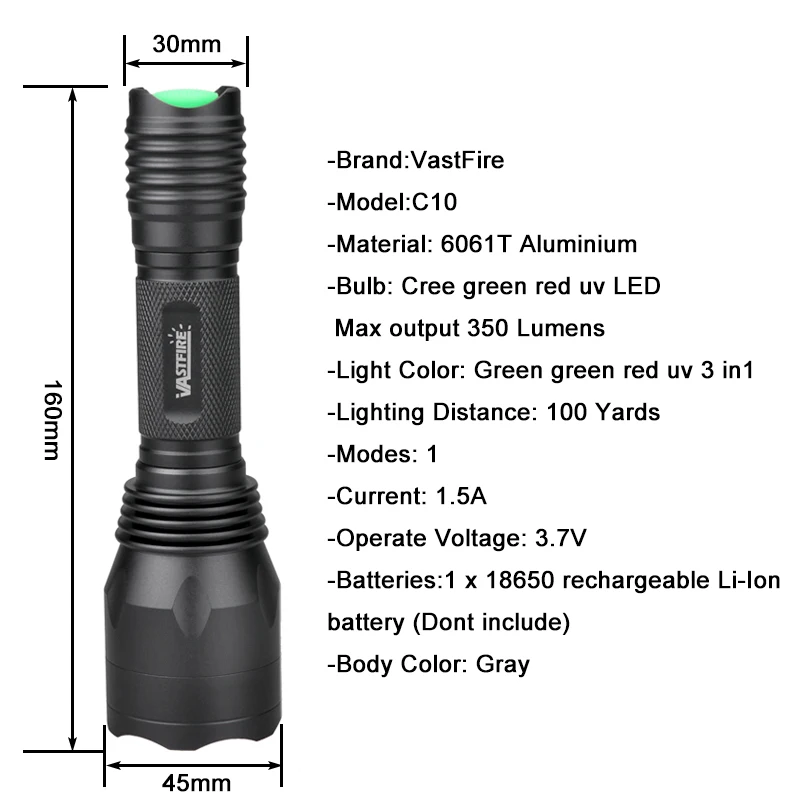 -Модель: C10 -Материал: 6061T алюминий -Лампа: зеленый, красный, УФ-светодиодный, максимальная мощность 350 люмен -Светильник Цвет: зеленый красный УФ 3 in1 -Расстояние освещения: 100 ярдов -Режимы: 1 -Ток: 1,5a -Работать Напряжение: 3,7 V -Аккумуляторы: 1 литий-ионный аккумулятор 18650 (в зависимости от вашего выбора) -Цвет корпуса: серый -Фонарь Размеры: 166x55x28 (мм)