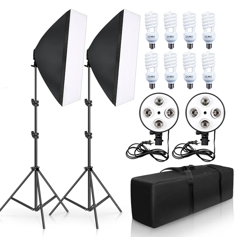 2 шт софтбокс (50x70 см)2 шт. держатель на светильник (4 лампы, подходит для 100-240 В)2 шт. 2 м светильник/штатив8 шт. 135 Вт Холодный светильник1 шт. сумка для освещения в Оксфордском стиле