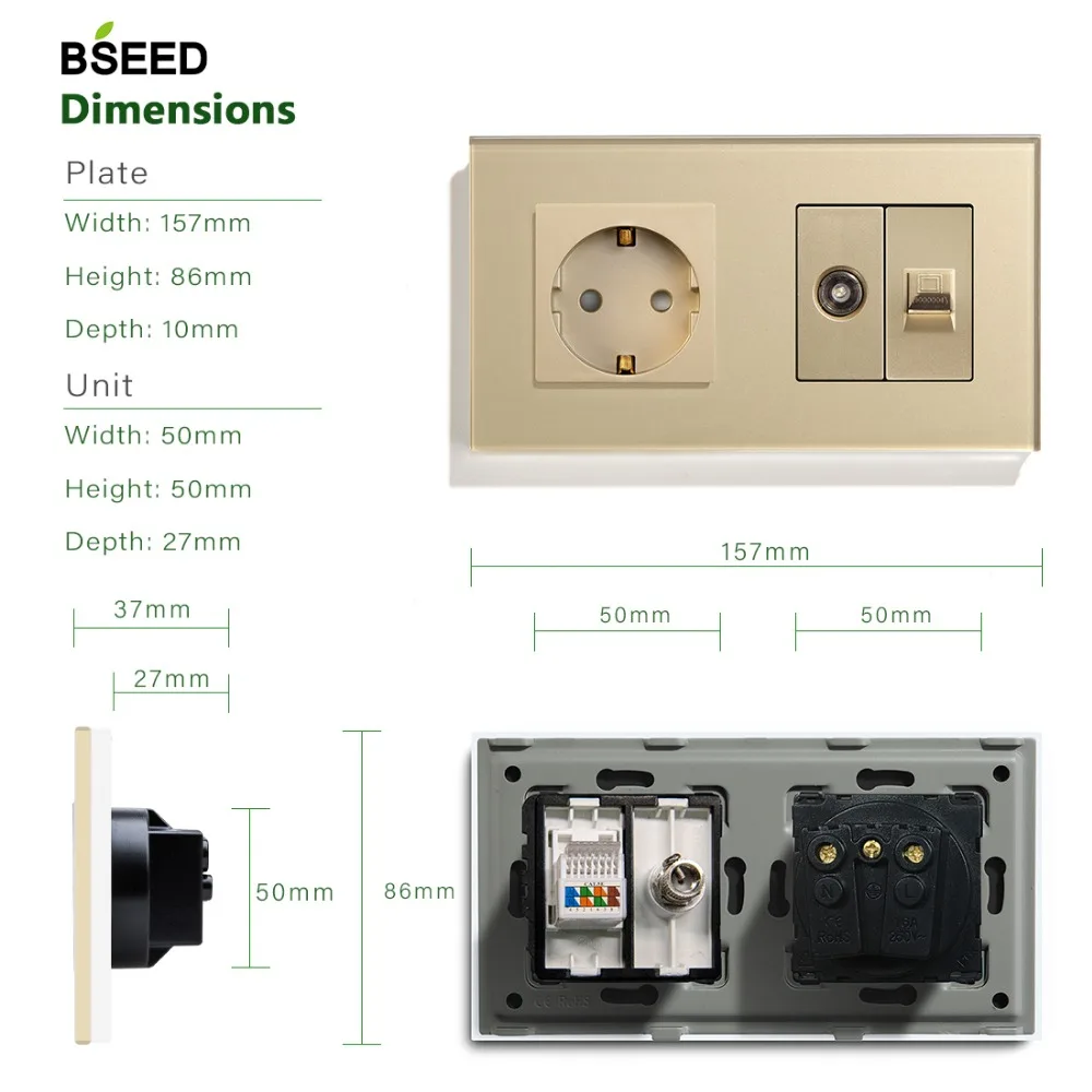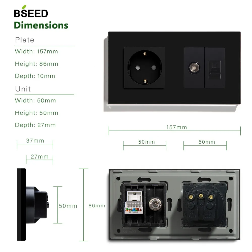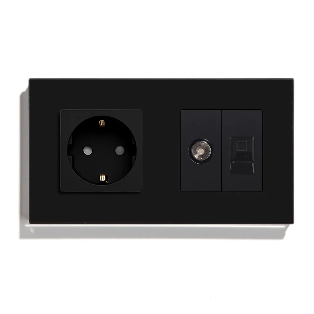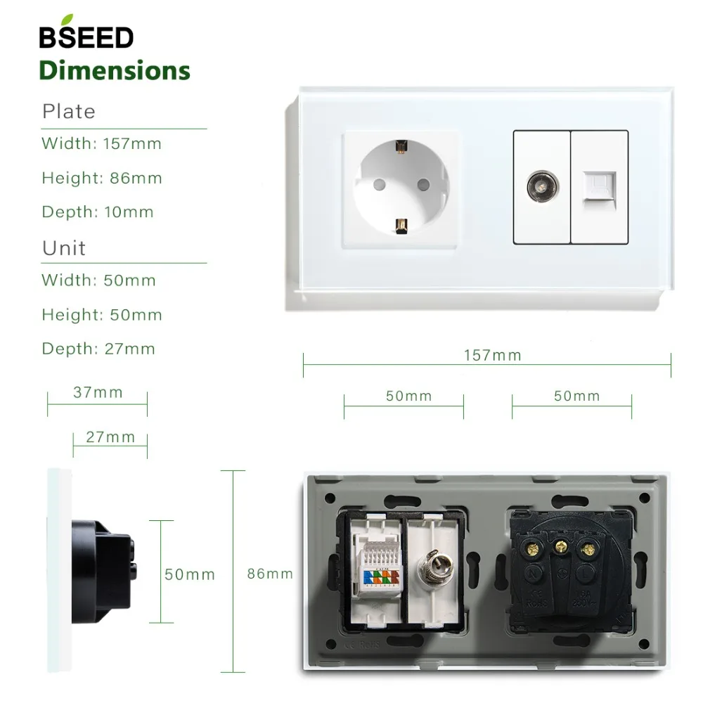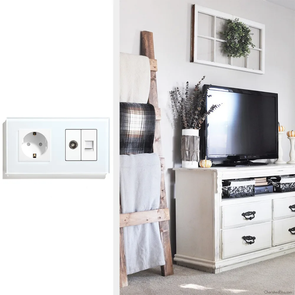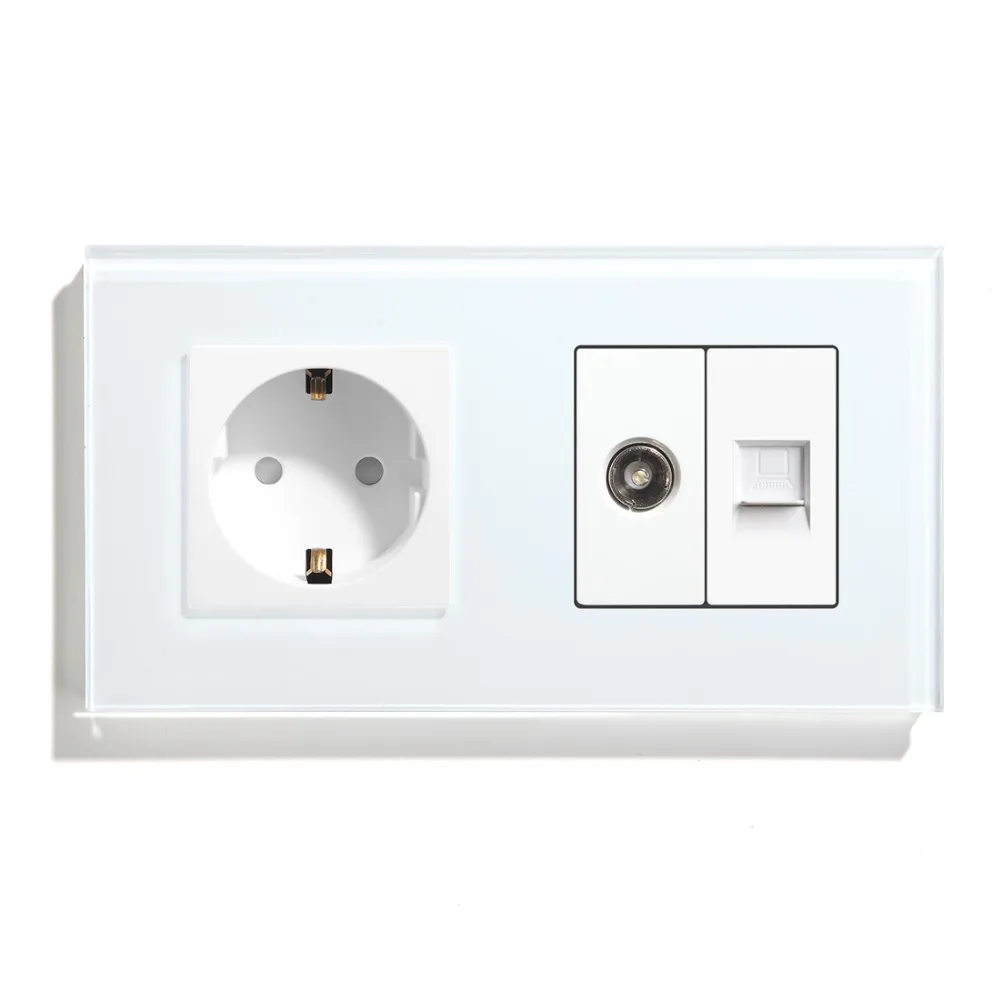 Настенная розетка BSEED TV PC с розеткой европейского стандарта, прозрачная стеклянная панель, белый, европейский стандарт