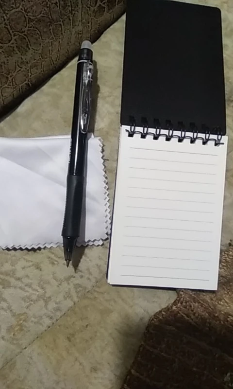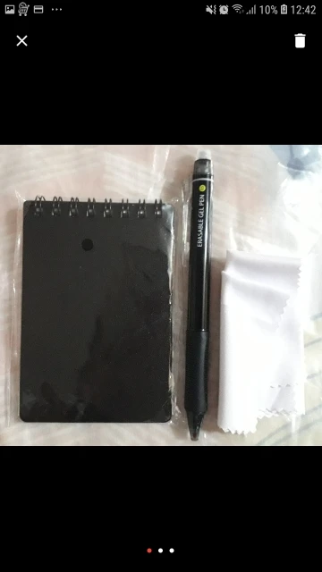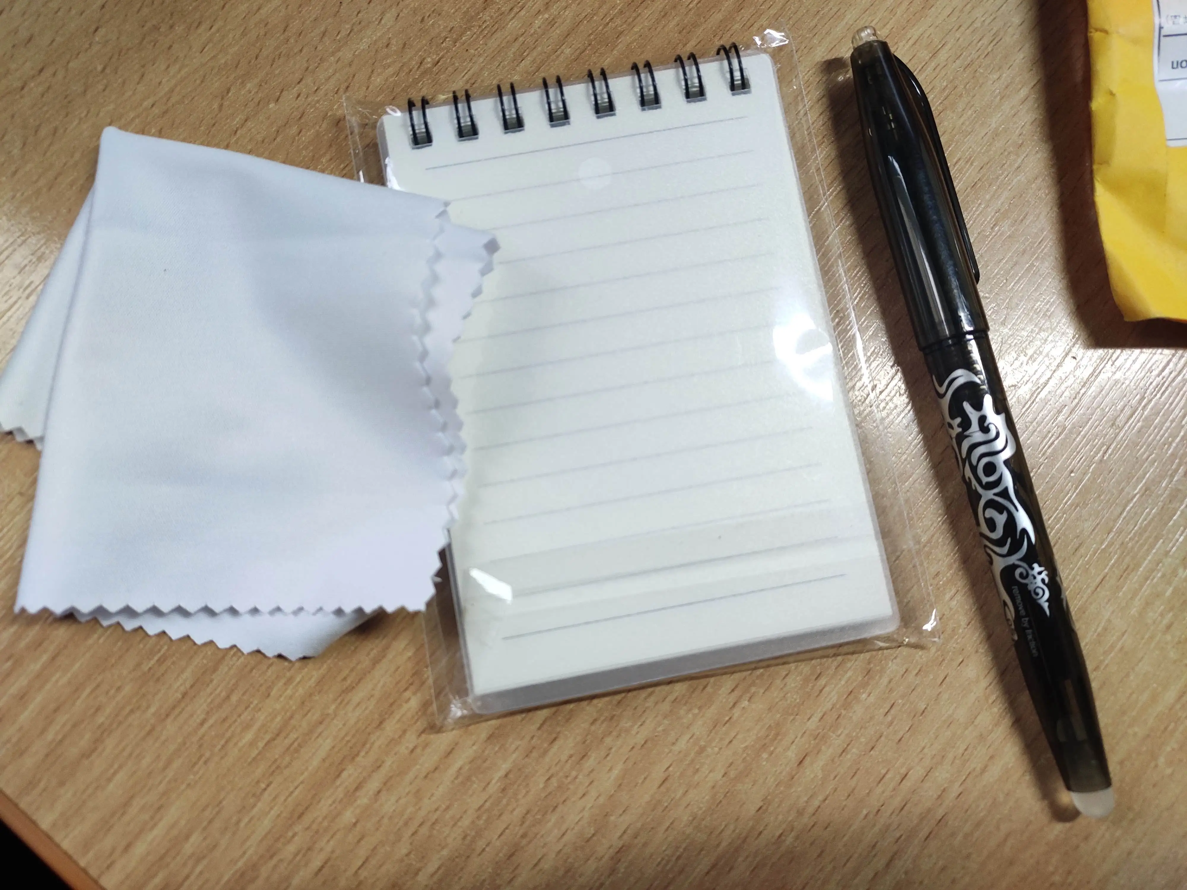 Дошел блокнотик и ручка. + тряпочка в комплекте. Листы гладкие-гладкие. Ручка пишет и сама же отлично стирает. Совсем миниатюрный, но пригодится. Продавец быстро отправил заказ. Купоны свои же принимает и не кидает. Рекомендую!