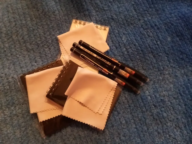 Очень довольна товаром!) в комплекте 2 блокнота белый и прозрачный, листы у блокнотом гладинькие и плотные. 2 ручки с ластиком на колпочке и 2 салфетки. все упаковано хорошо, дошло всё целое, ручка хорошо пишет и с блокнота все хорошо стирается когда немного подсохнет.Салфеткой лучше пользоваться немного намочив её. Доставка до Красноярского края меньше месяца. Товар рекомендую к заказу.