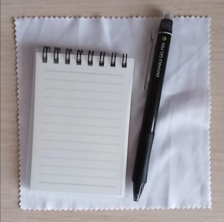 Посылка укомплектована полностью: блокнот, салфетка, ручка. Странички блокнота похожи на микс бумаги и пластика. Действительно, легко стираются надписи с помощью салфетки. Легко пишет на таких страничках карандаш, также легко его стирает салфетка.
