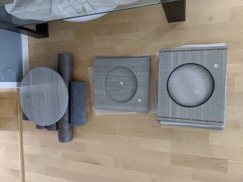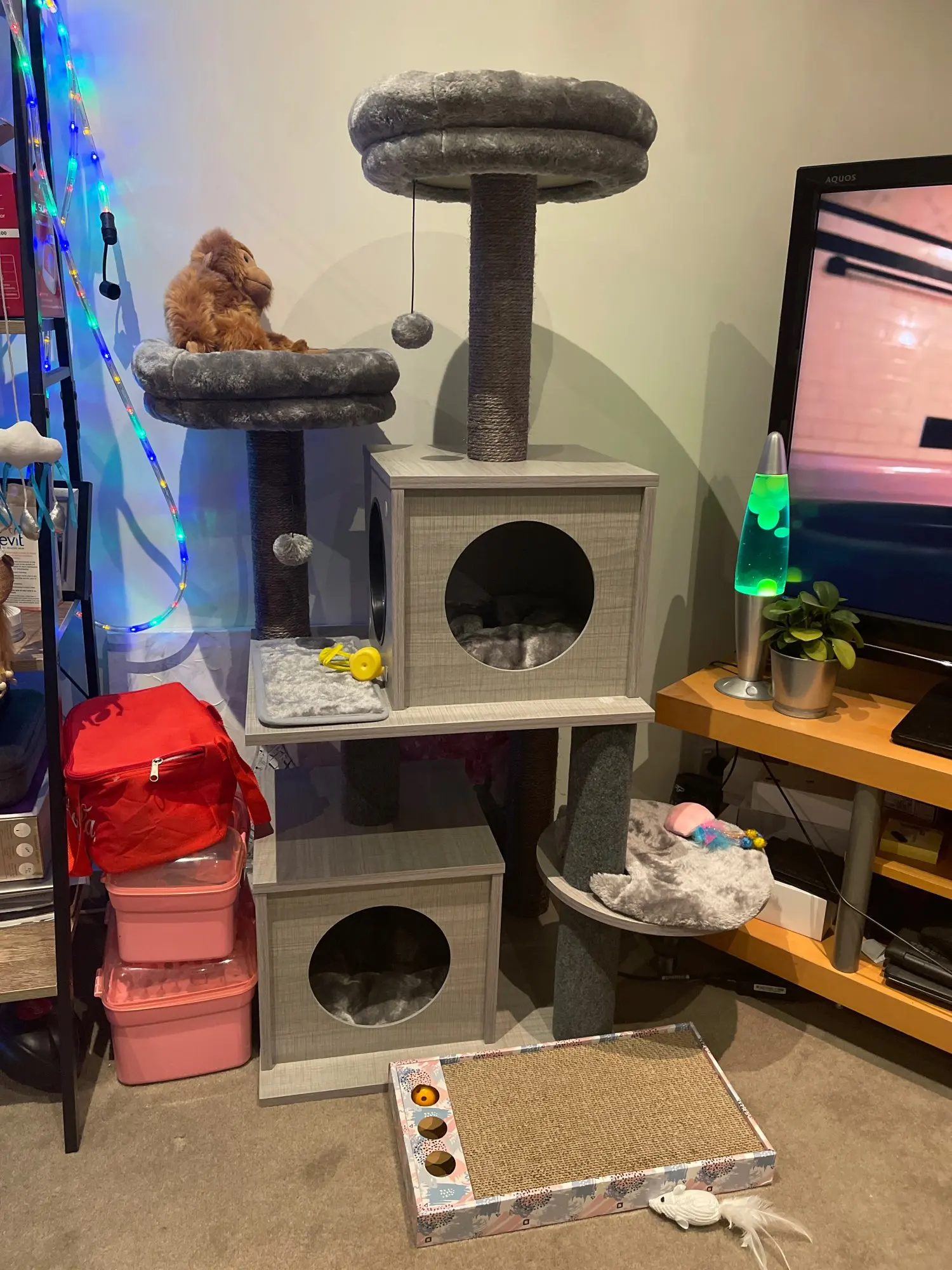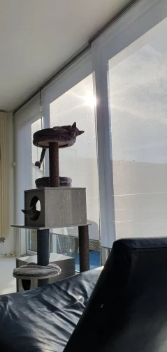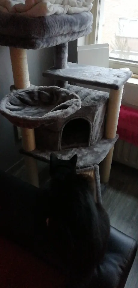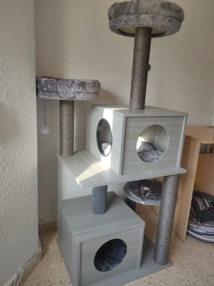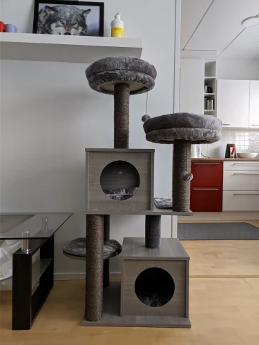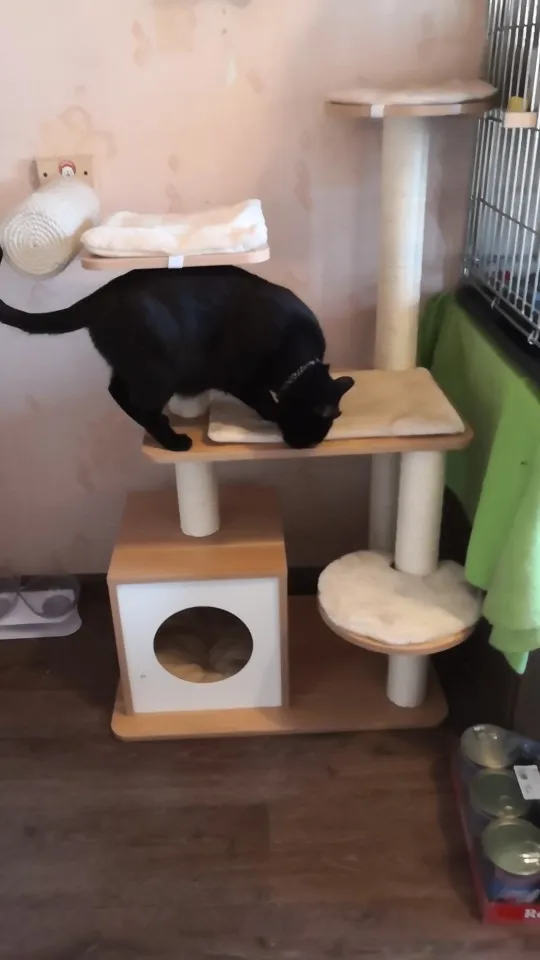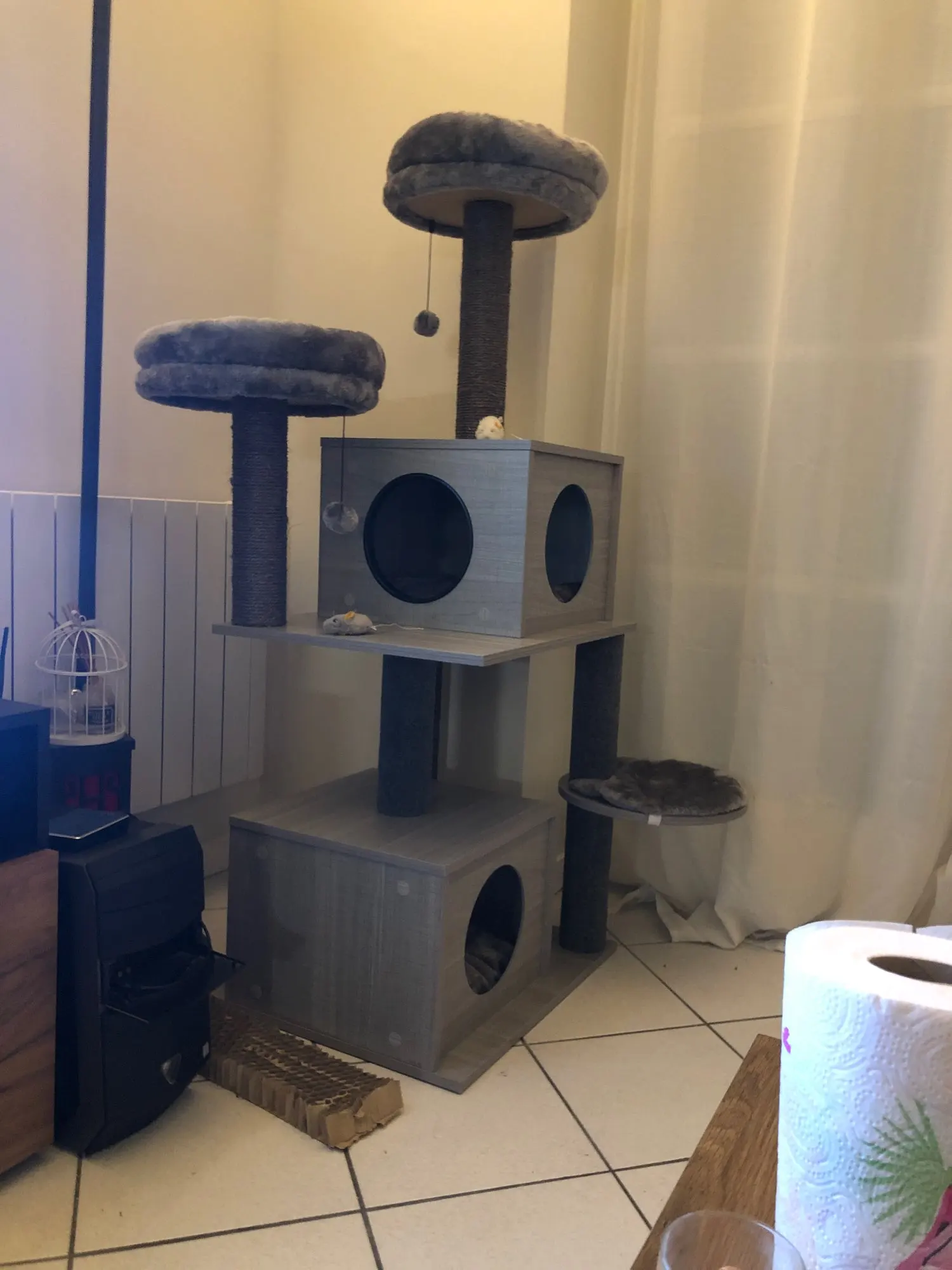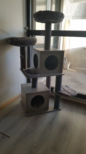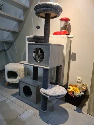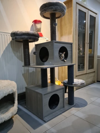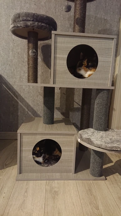 Mes chats ont immédiatement adopté cet arbre à chat. Les niches sont grandes et faciles à nettoyer car en mélaminé, comme les plateaux, donc les poils de chats ne peuvent pas s'accrocher. Les coussins sont amovibles. le look est moderne. Je vais l'associer au poteau qui va du sol au plafond. Mes chats vont pouvoir se défouler !