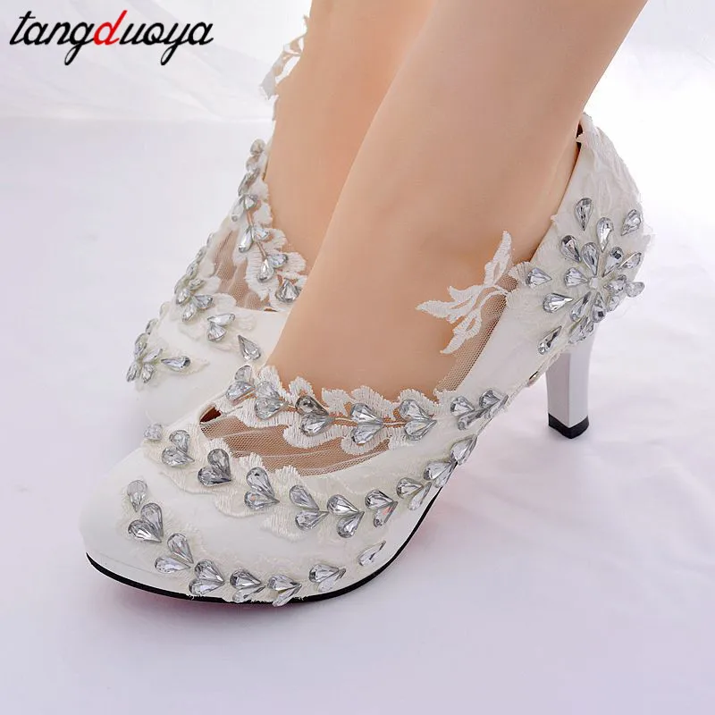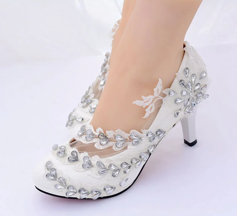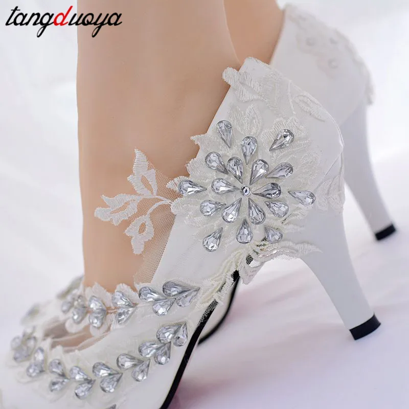 Свадебные туфли с цветочным узором; Белые кружевные женские туфли-лодочки на высоком каблуке; Женская обувь; Вечерние туфли на высоком каблуке со стразами; Женская обувь