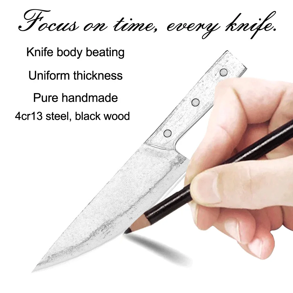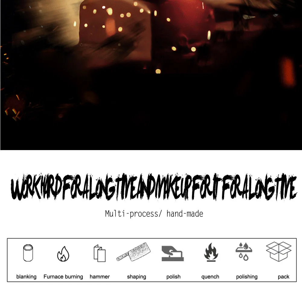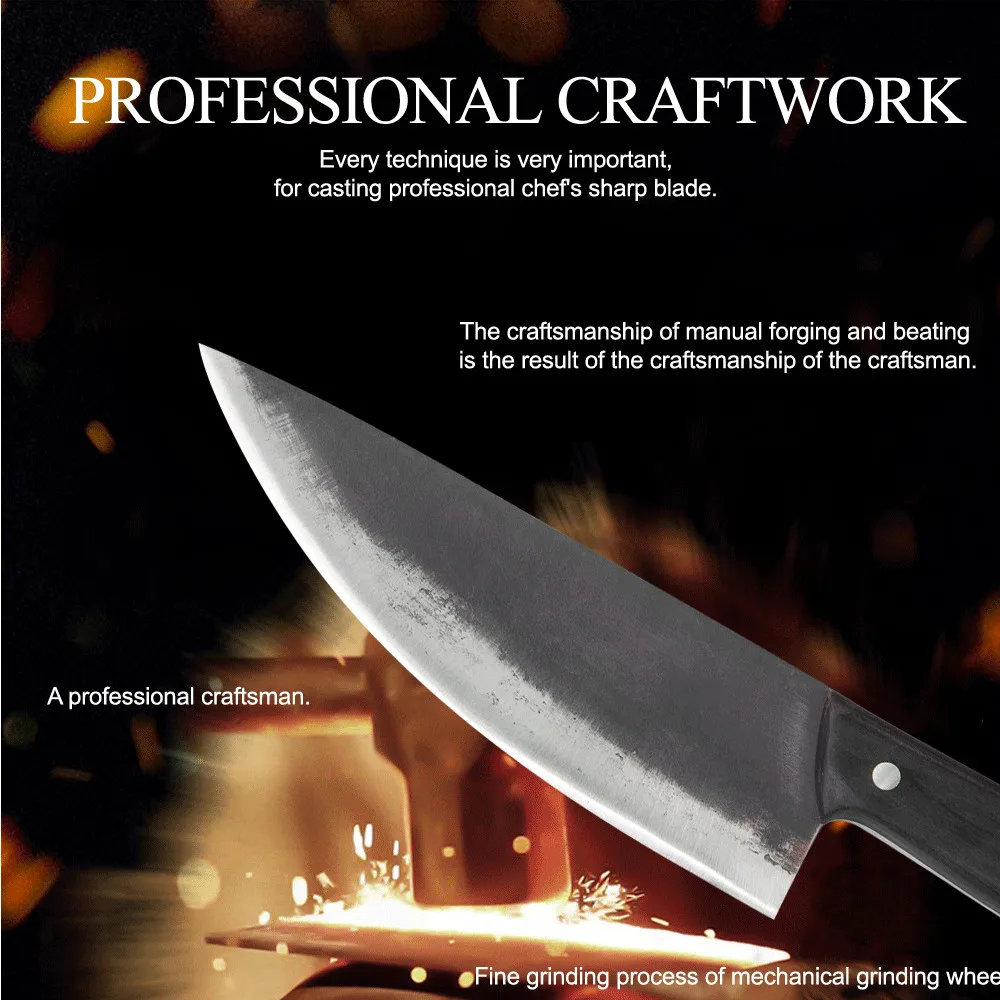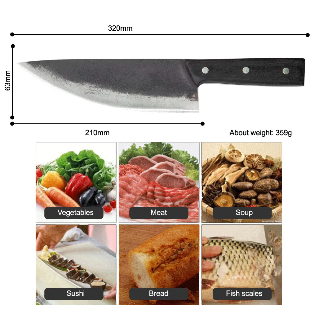 Китайский кухонный нож, выкованный вручную. Изготовлен из марганцевой стали, ручка и лезвие интегрированы без пайки, что является прочным и прочным для устранения сломанной ручки. Ножи заточены вручную работниками с более, чем 30-летним опытом работы с помощью натуральных нож шлифовальные добываемых из Mount Emei. По сравнению с кухонными ножами, изготовленными механическими способами, срок службы таких ножей больше. Кованые ножи имеют более высокое содержание углерода. Внимание следует обратить на очистку, кислотные или щелочные вещества, которые не могут оставаться На лезвиях в течение длительного периода времени. Такой нож должен быть вытерт сухой после очистки. Некоторые кулинарные масла могут быть применены на нем, если он не используется в течение длительного времени. И он должен быть помещен в сухом месте для хранения.