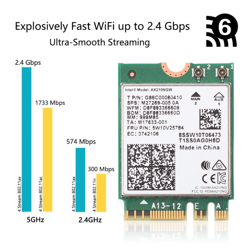 Ax210 показывает некоторые впечатляющие результаты. Работает только с драйверами intel с сайта, в настоящее время windows не обновляется. Также он имеет Новое Подключение антенны, меньше, чем старый ipex4. Имейте это в виду. Настоятельно рекомендуем!