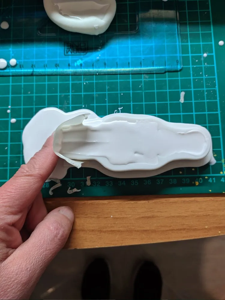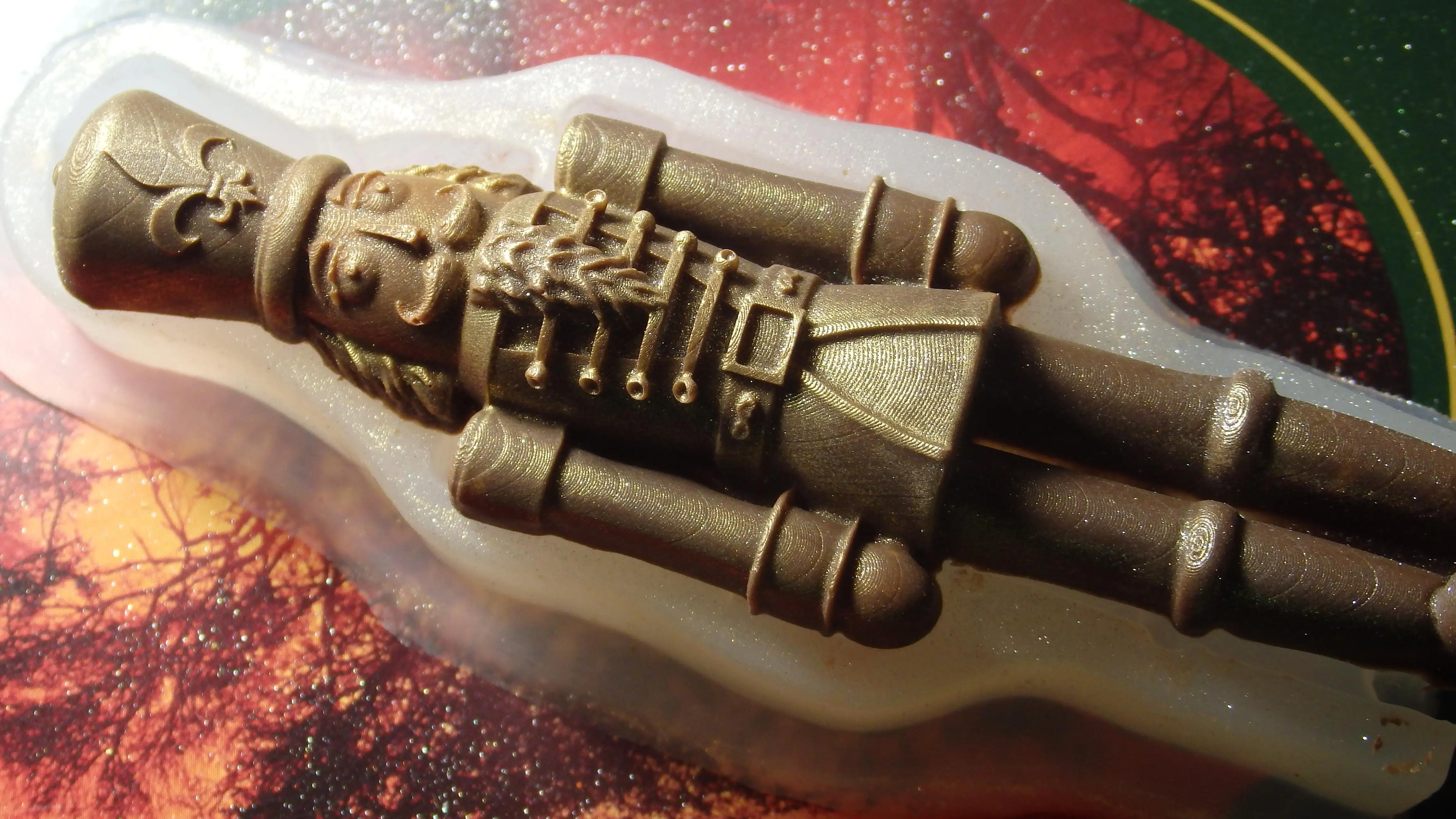 Молд хороший, но невозможно работать с жидким материалом. Через ноги солдата все вытекает. Только полимерная глина, пластилин или кондитерская смесь. Гипс и смола вытекает. Сейчас придумываю, чем закрепить низ. Неудобно.