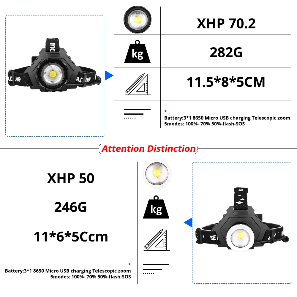 Налобный фонарь XHP70.2 светодиодный с зарядкой от USB, 10000 лм, 3x18650
