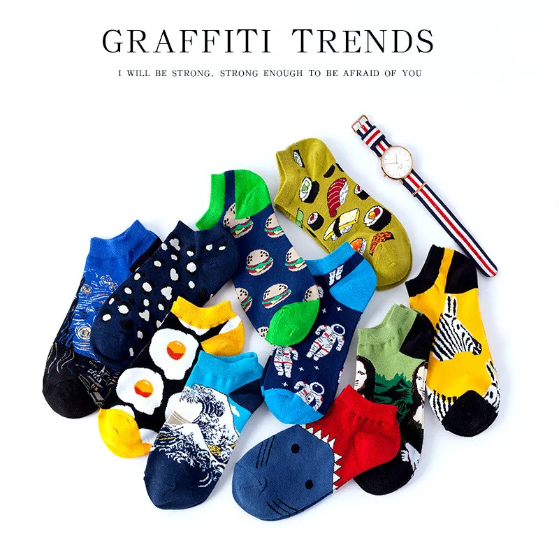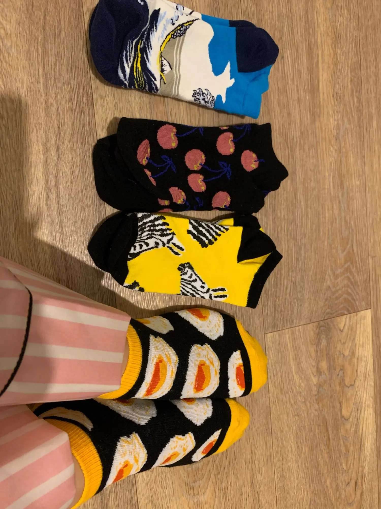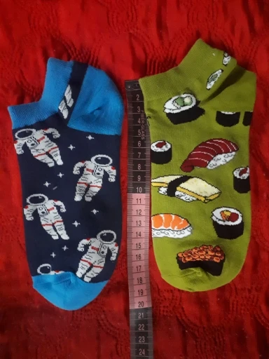 Симпатичный дизайн. Пожалуй, это единственный плюс. Материал - просто жуткая синтетика. Часто заказываю носки на Алике, но такого паршивого материала не встречала ни разу. В обуви скользят, запах появляется через 1 час носки. Ужасный материал.