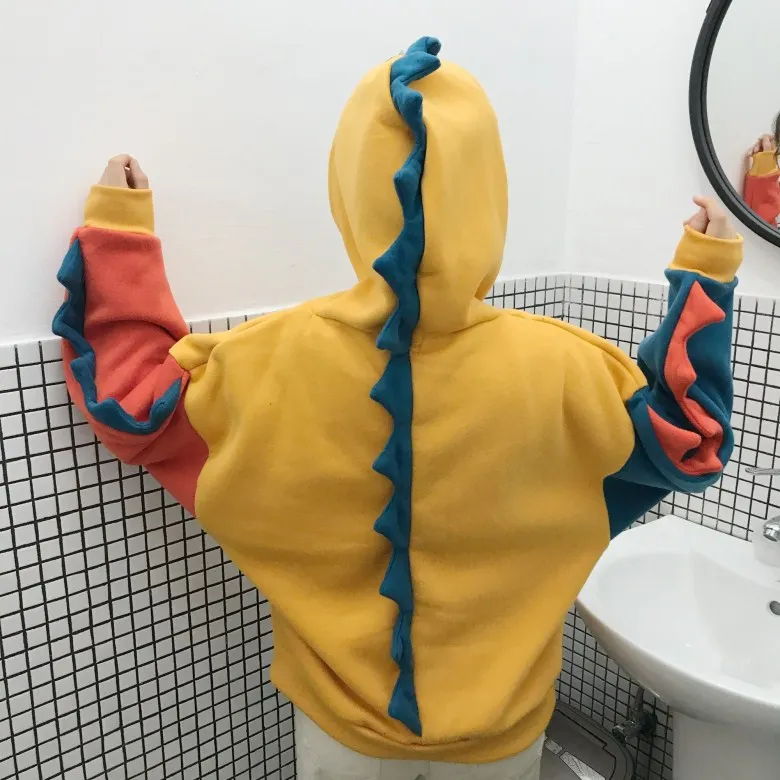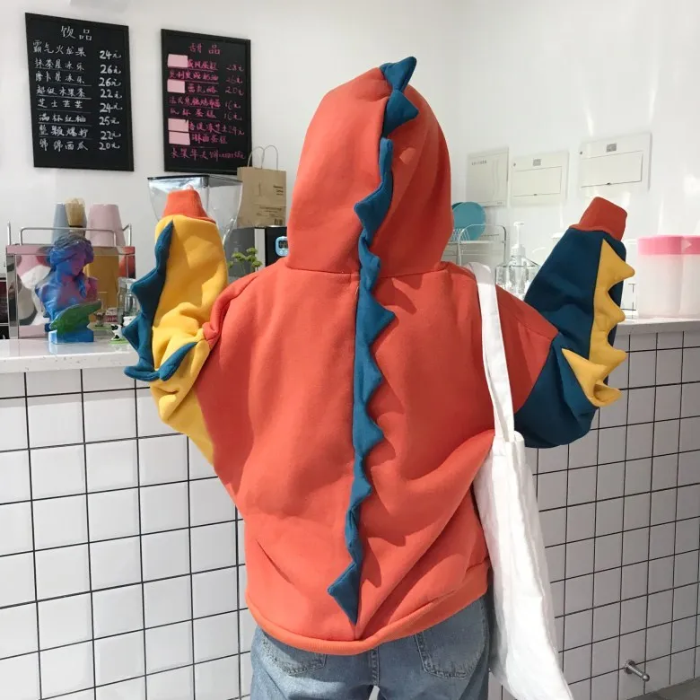 Милые толстовки с капюшоном в стиле Харадзюку, Женский пуловер большого размера, спортивный костюм с динозавром, зима