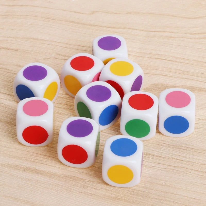Характеристики:Стороны: 6Материал: акрилРазмеры: app.15mm/0,59''Цвет: зеленый, синий, розовый, желтый, красный, фиолетовыйКоличество: 10 шт.