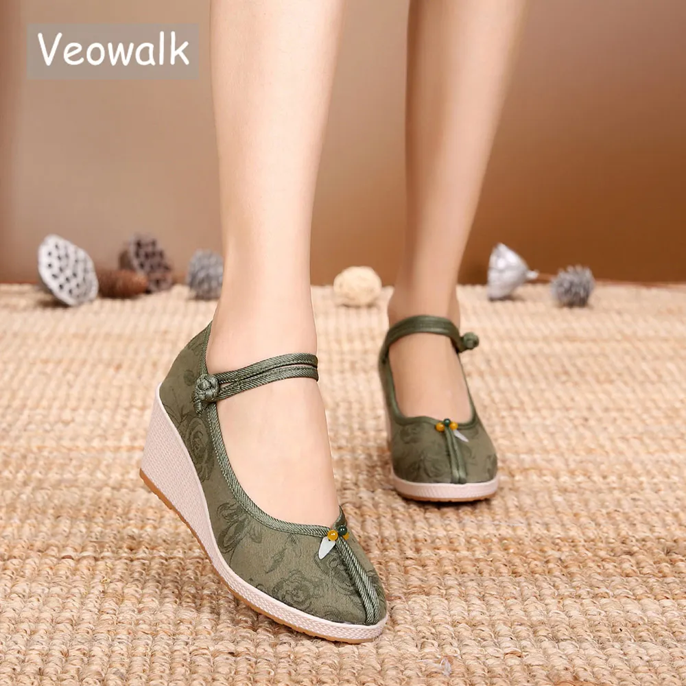 Veowalkмягкие женские туфли из жаккардового хлопка на танкетке; Удобные женские повседневные туфли-лодочки; Туфли ручной работы на высоком каблуке 7 см с вышивкой