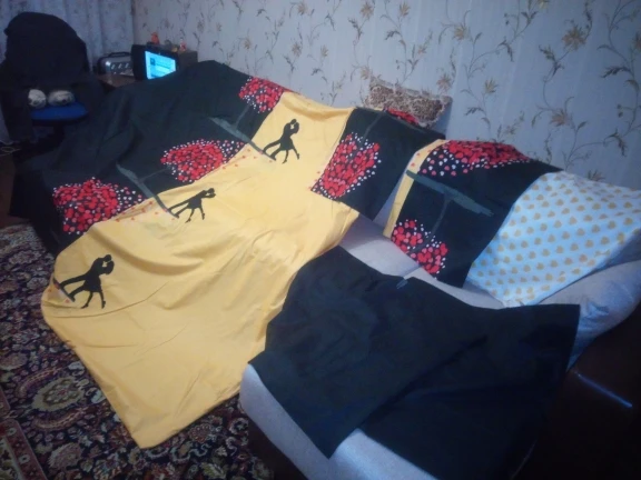 Комплект не плохой, брал семейный. Думал пододеяльники будут разной расцветки, черный и жёлтые но нет расцветка одинаковая. Материал довольно плотный, летом будет жарко под ним спать.