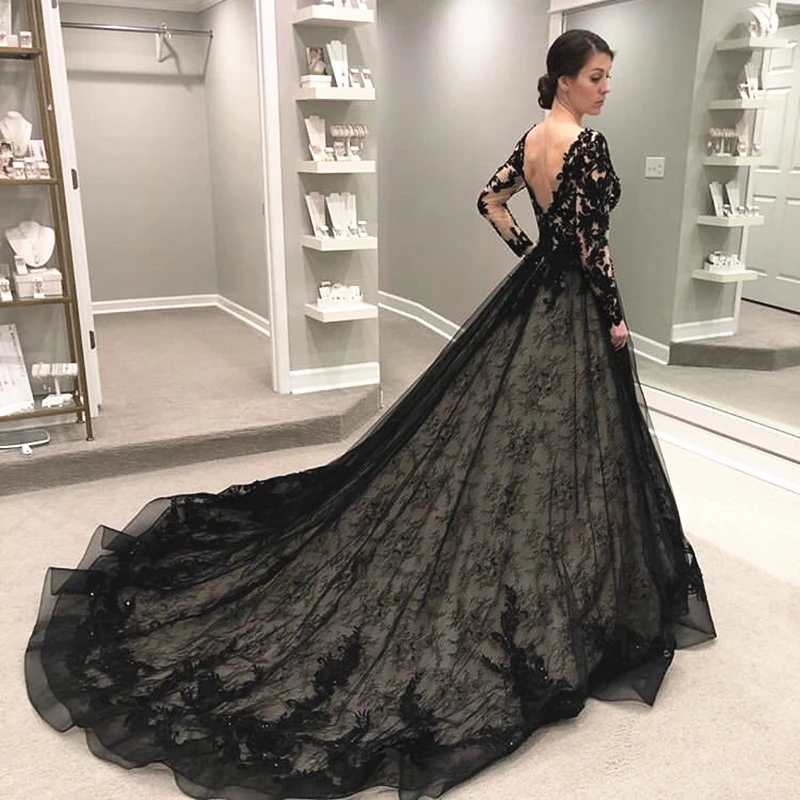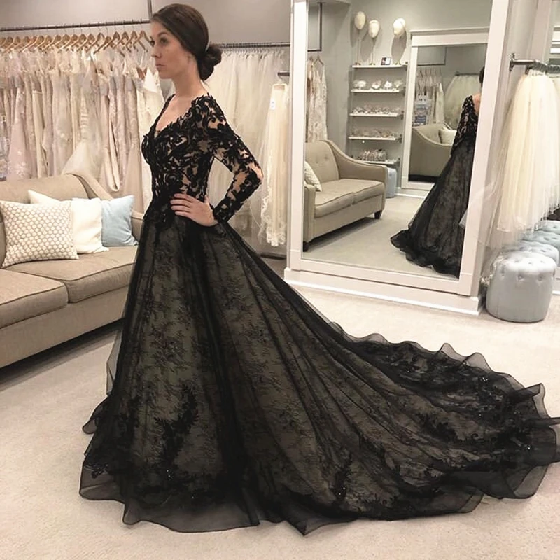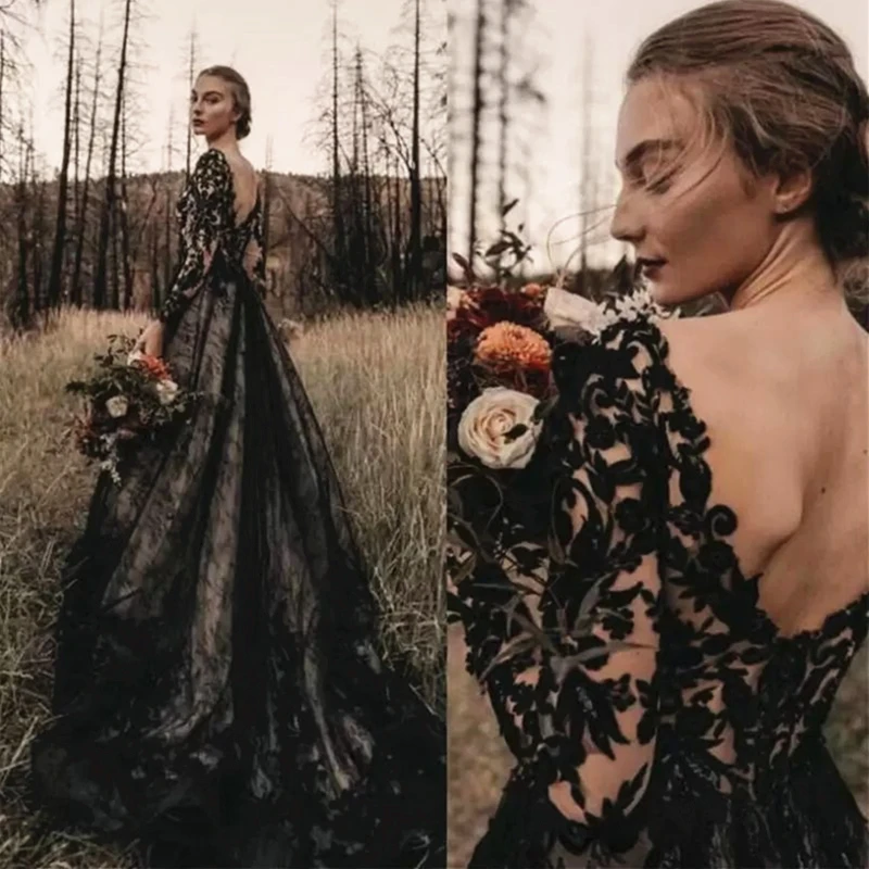 Женское кружевное свадебное платье, готическое черное платье с длинным рукавом, аппликацией, а-силуэт, винтажное классическое платье невесты, индивидуальный пошив