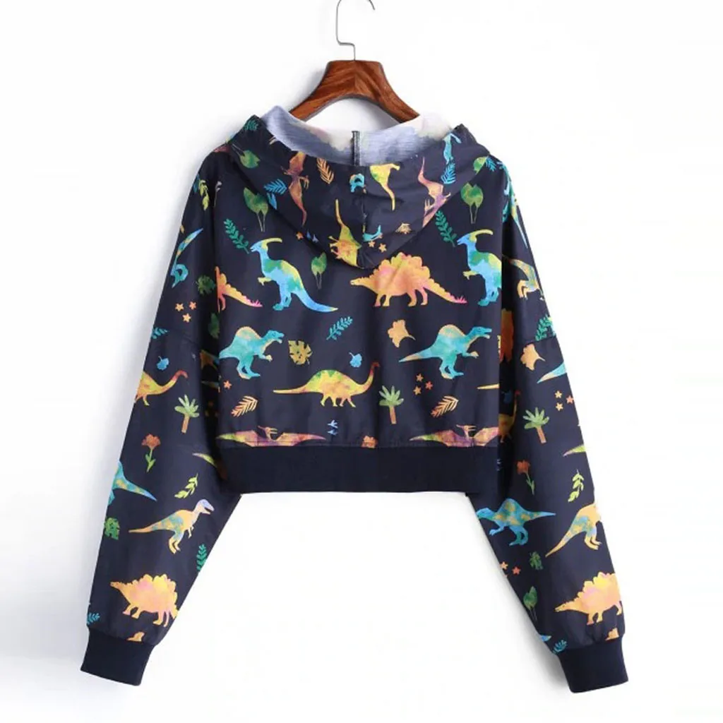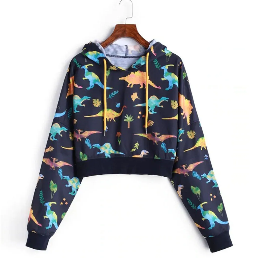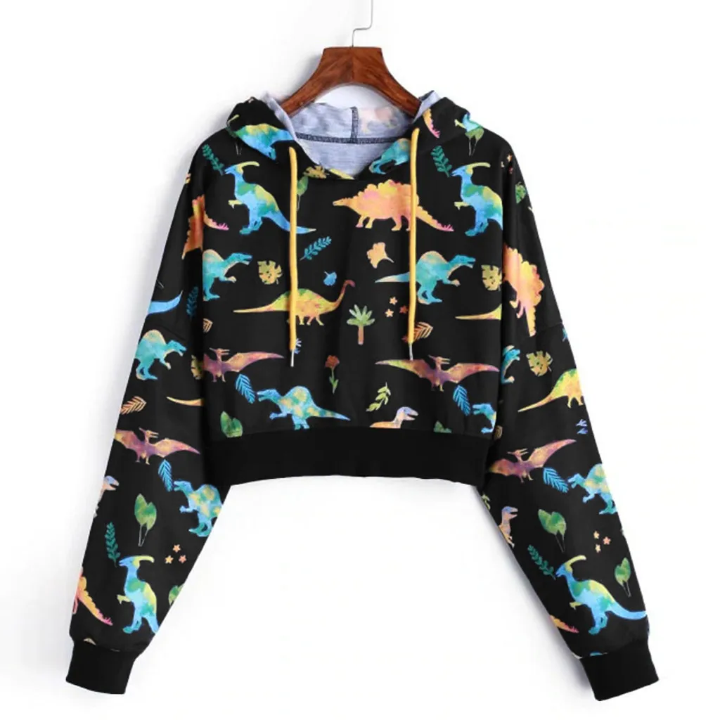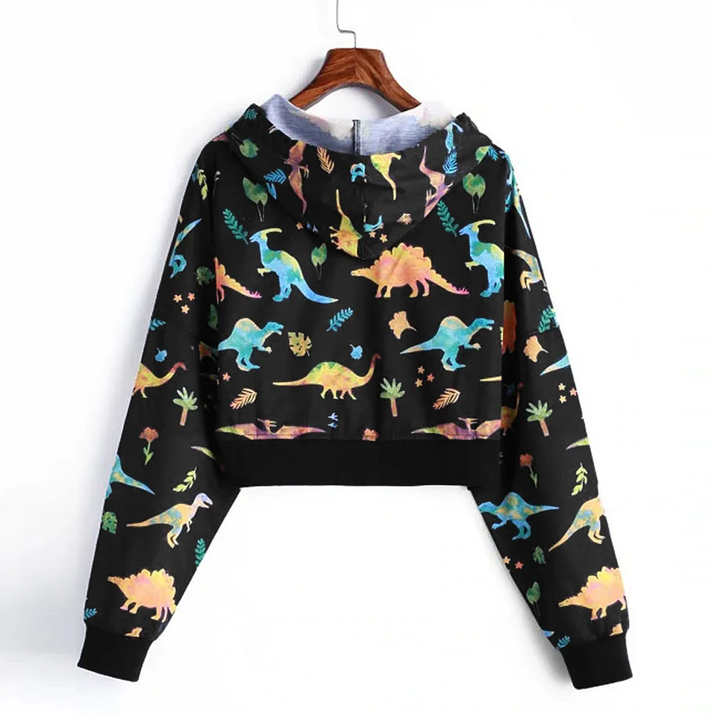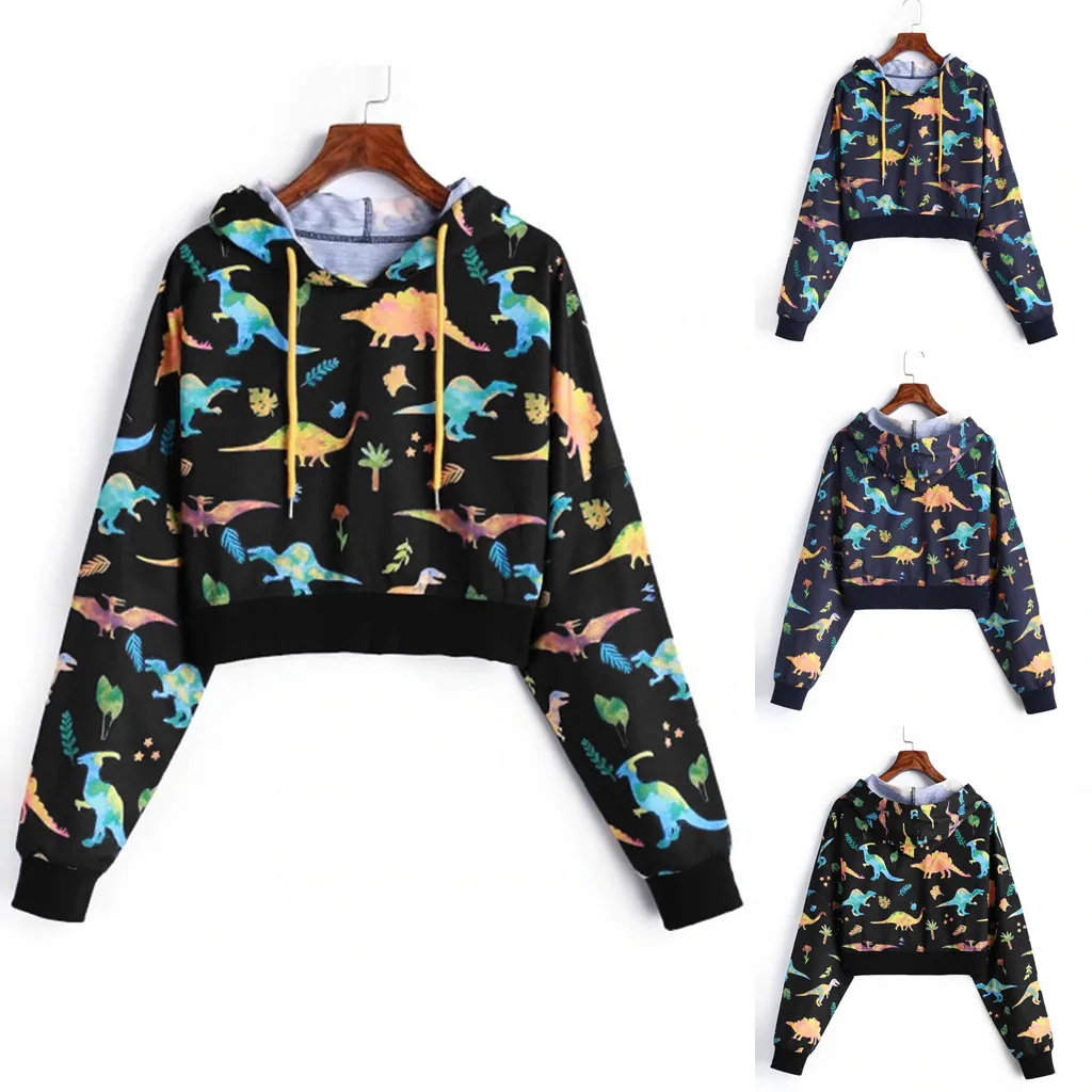 Женская толстовка с длинным рукавом, короткий пуловер с капюшоном и принтом динозавра, 15, 2019