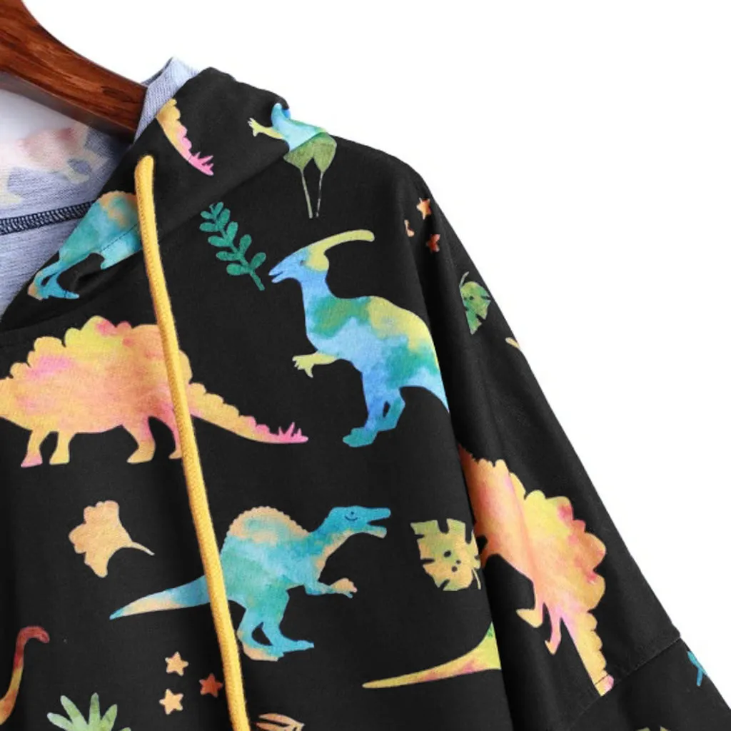 Женский Повседневный пуловер с капюшоном и длинным рукавом, короткий свитшот с принтом динозавра