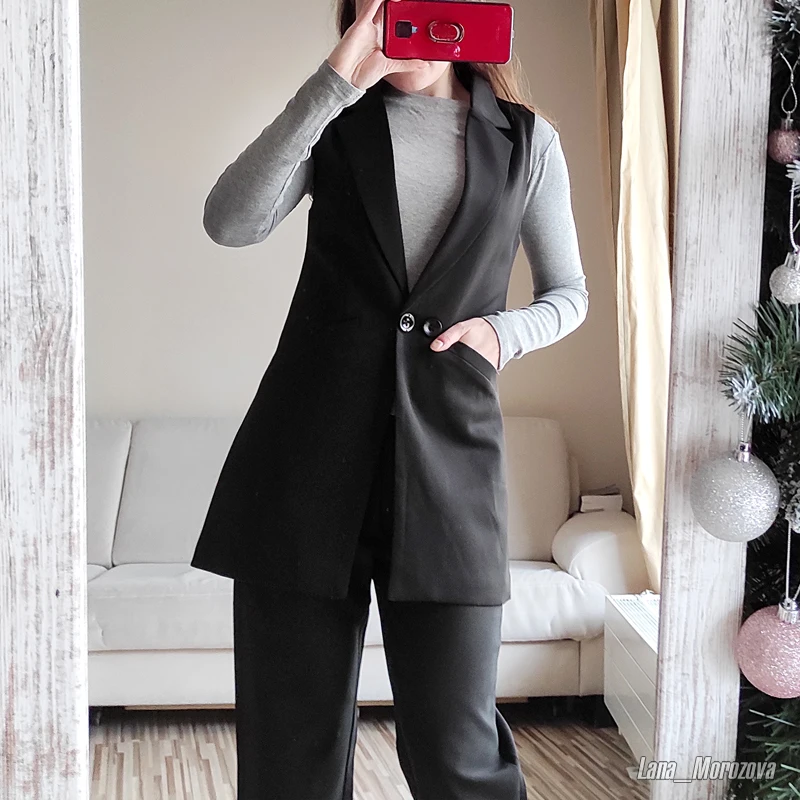 Доставка была быстрой, жилет приехал без негативных нюансов. На свои объемы в 86-67-94 я выбрала самый маленький, и посадка меня устроила - жилет сидит немного свободна, так, как и предполагает крой. Жилет выполнен качественно. Внешняя ткань костюмного плана - гладенькая, без блеска. Внутри подкладка в тон. Фасон приближен к классическому - с отложным воротником и скромными прорезными карманами, с застежкой имитирующей двубортную. Жилет, конечно же, виглядит очень стильно!