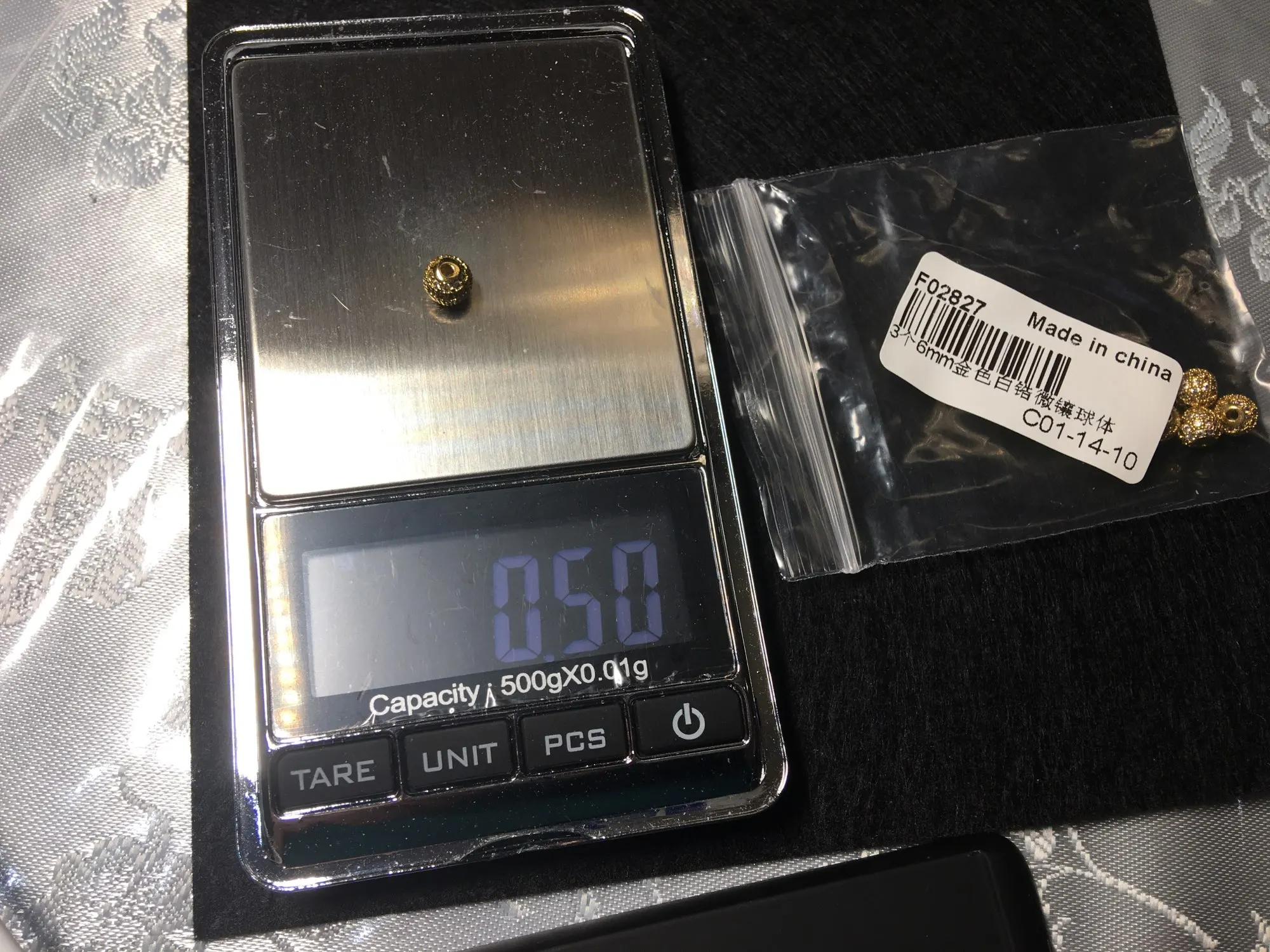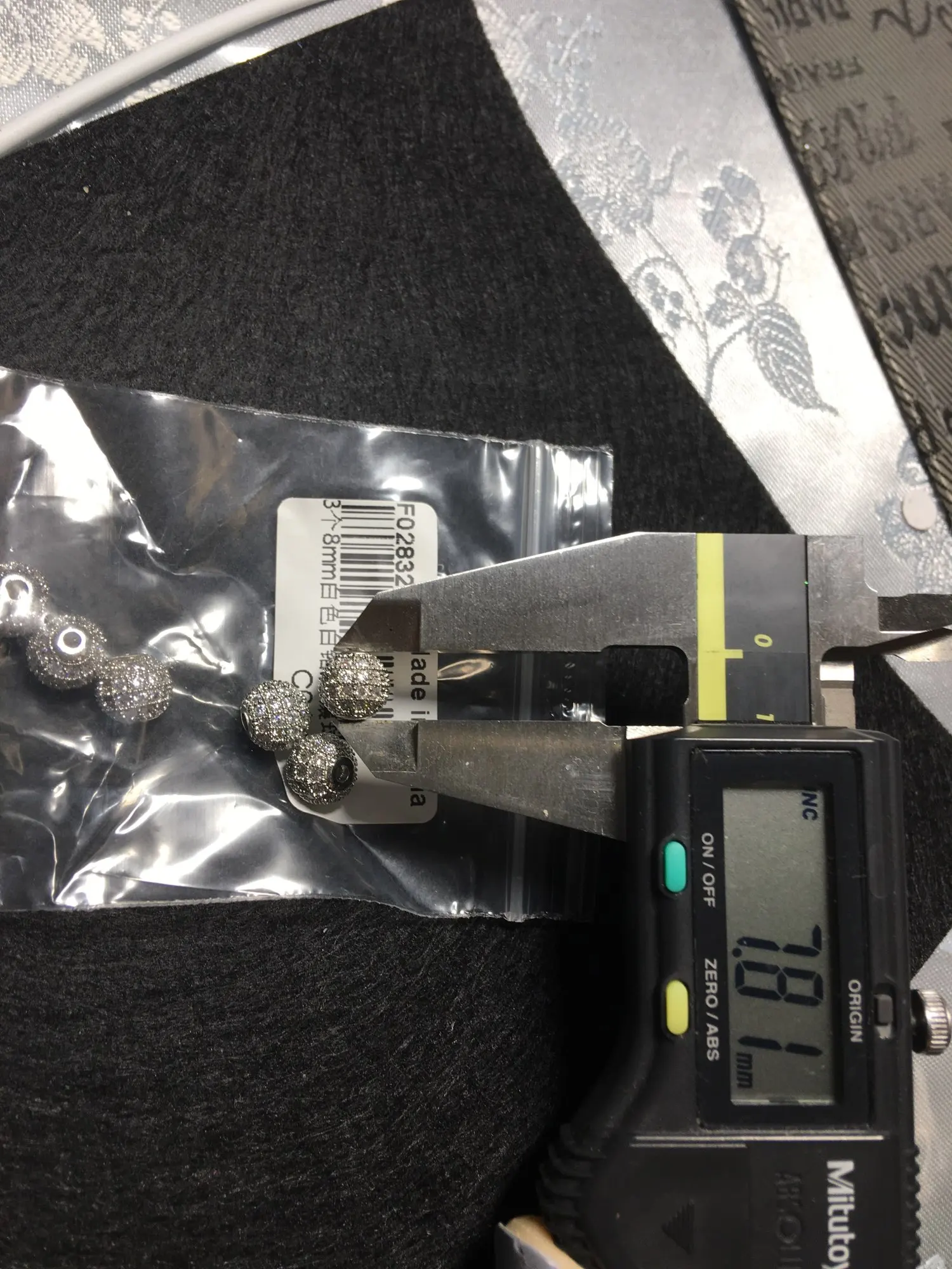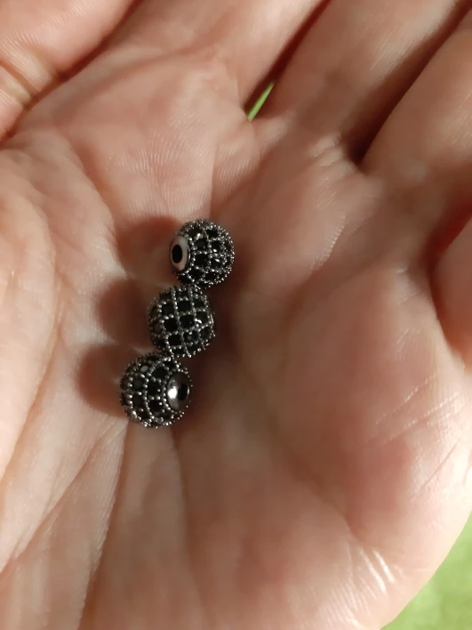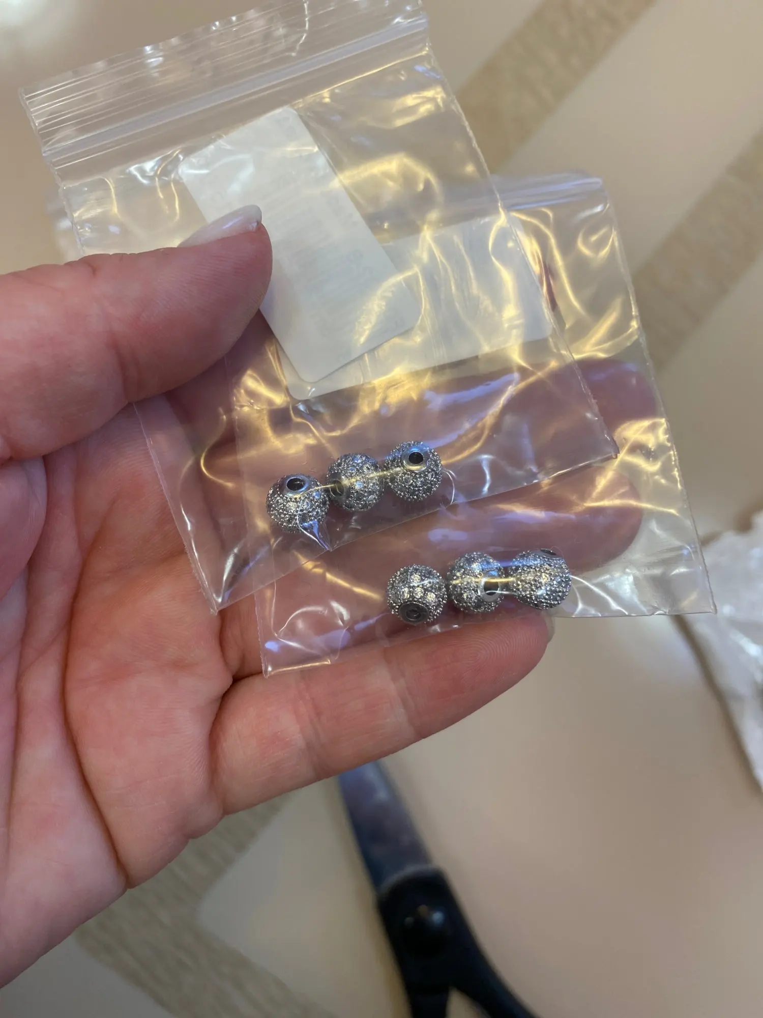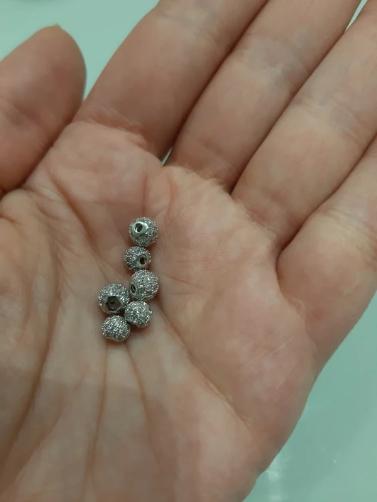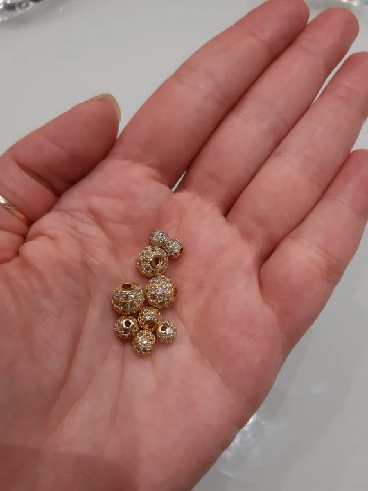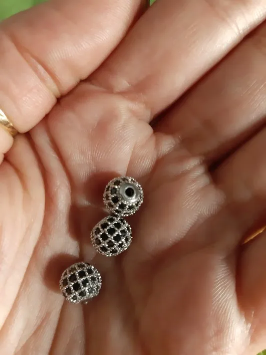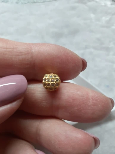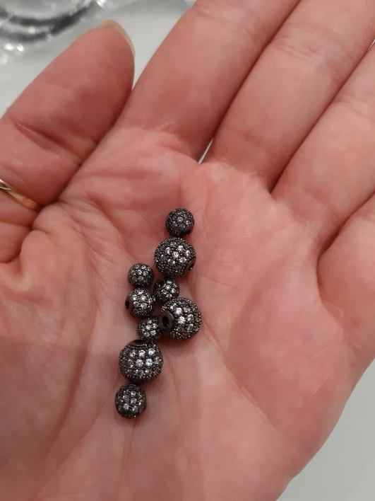 Размеры немного не совпадают с заявленным, но меня все устраивает. Заказала 3 размера: 4см, 6см и 8см, вес и размер видны на фото. Бусины аккуратные, вне зависимости от размера на каждой бусине 4 ряда кристалликов. Рекомендую