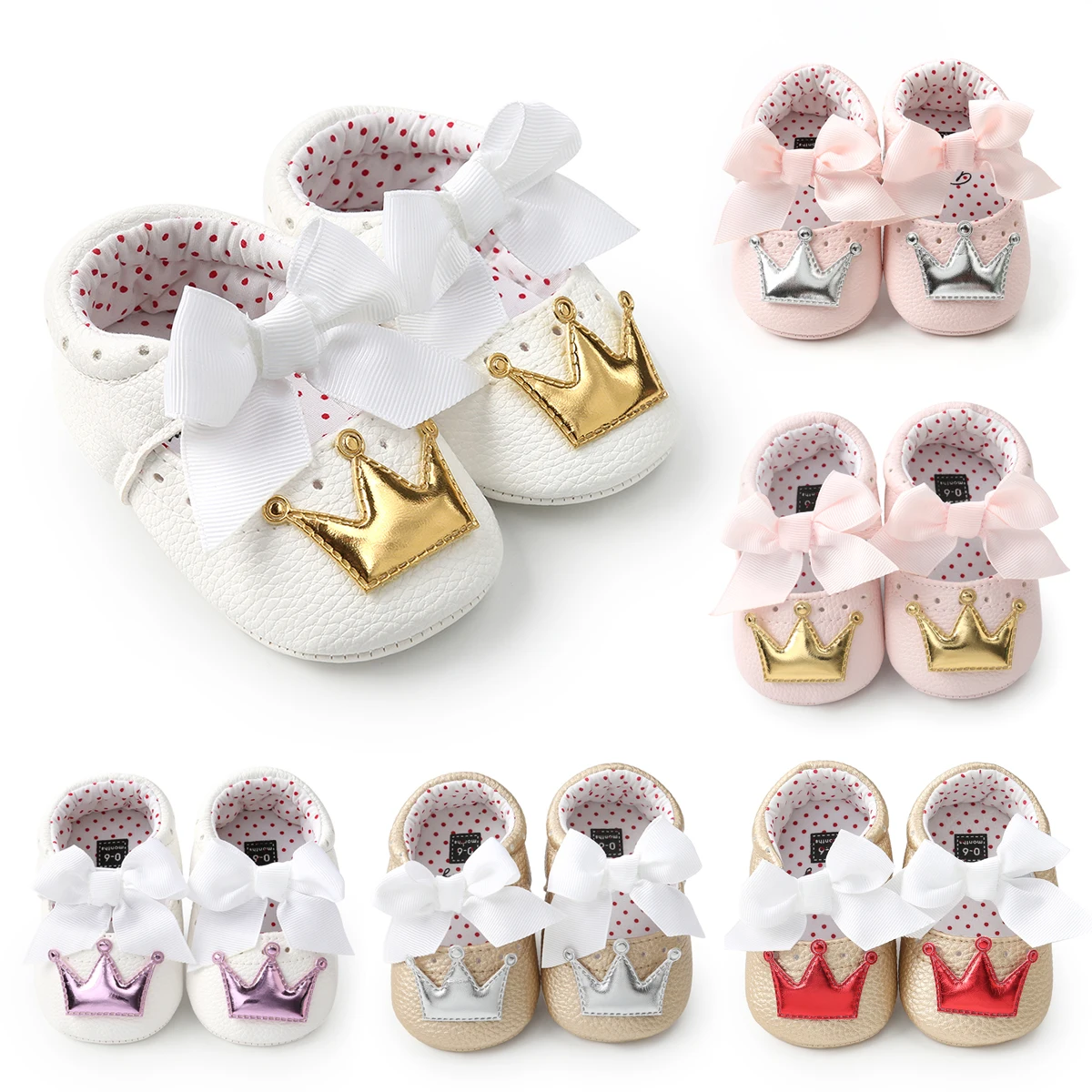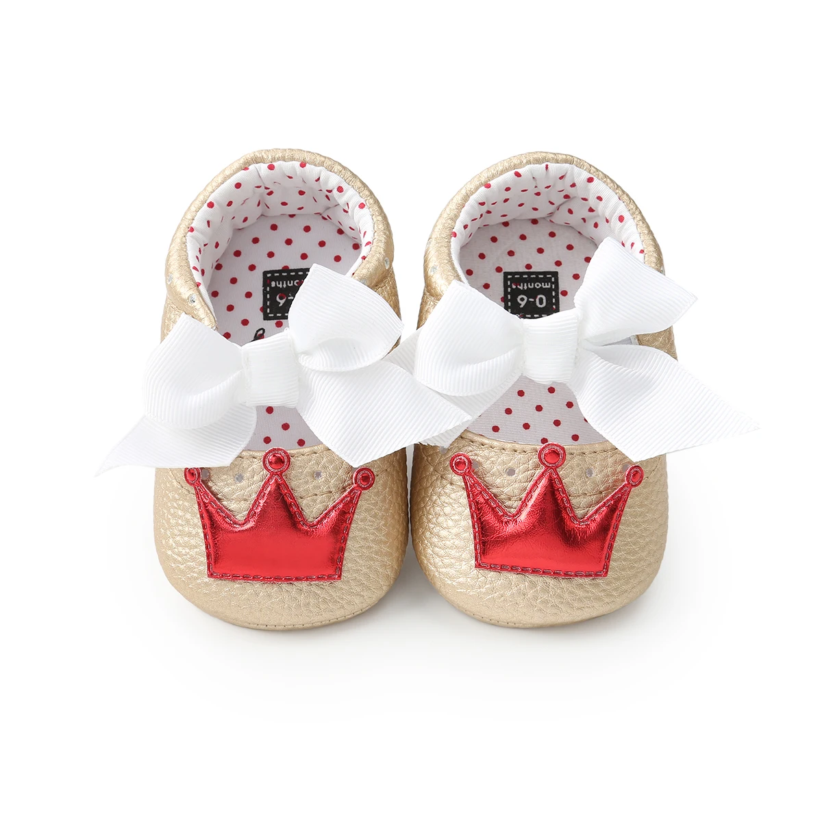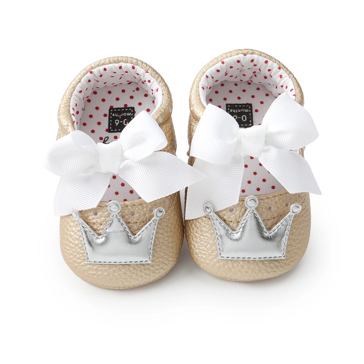 Детская обувь для девочек с короной и бантом, нескользящая обувь из искусственной кожи на резиновой подошве для новорожденных