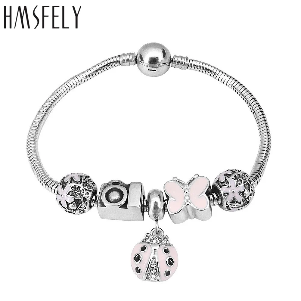 HMSFELY 316L нержавеющая сталь очаровательный розовый браслет для женщин Божья коровка Бабочка Бисер женские ювелирные изделия круглый шар Пряжка Браслеты